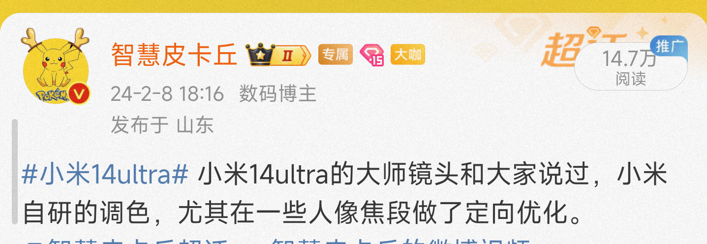 给大家说的小米大师人像官宣了,还公布了样张,景不压人,小米14ultra每个人像焦段都有大师调教,出片很有质感,而且有大片的味道,电影画质的仪式感,小米影像调教的最后一块短板补齐了。