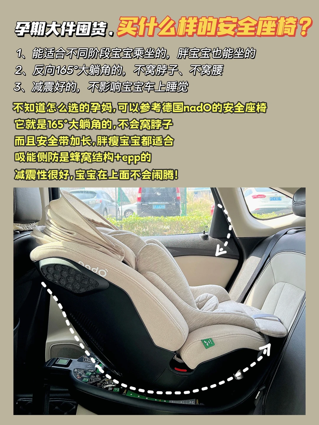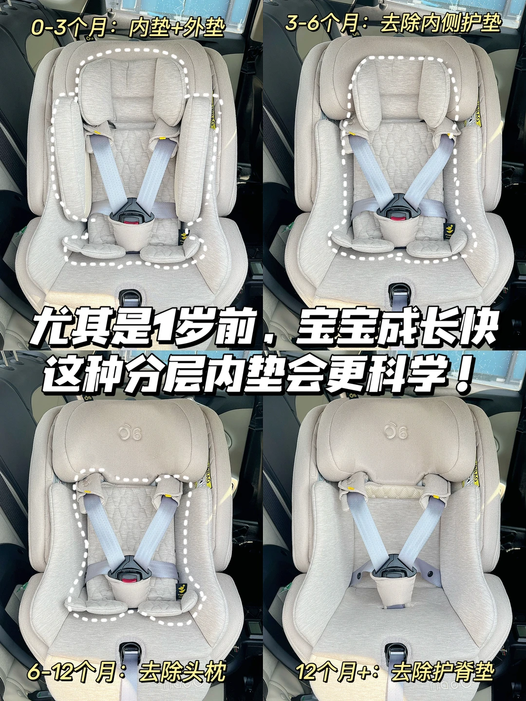 🔹着重看是否适合不同阶段宝宝乘坐!尤其1岁前,宝宝成长是飞速的,一天一个样,一成不变的安全座椅,可能会不贴合宝宝身体,导致不舒适哭闹的情况。✔️建议选有新生儿内垫的座椅,对小宝宝的包裹性更好。夸一夸nadO式分层内垫,可根据宝宝成长及时调节,搭配加长安全带,胖瘦宝宝都适合!