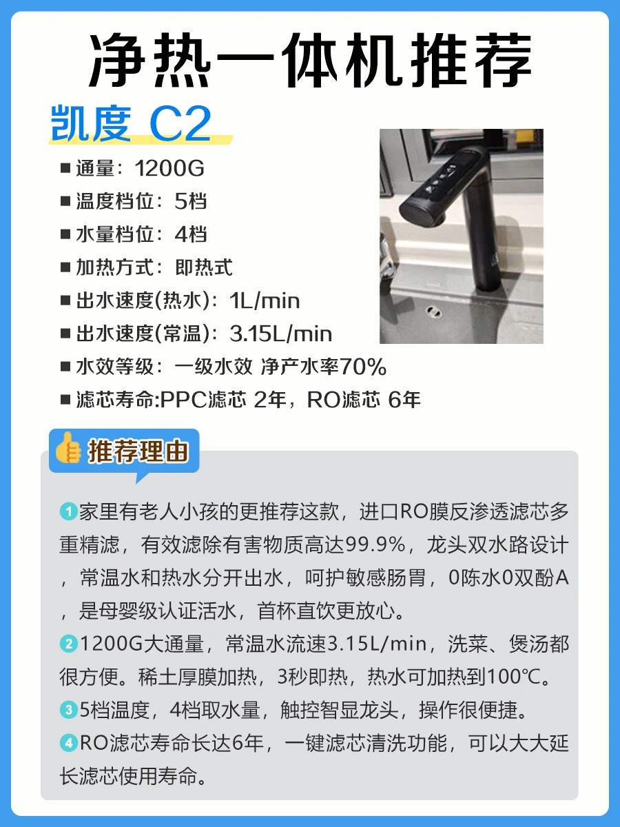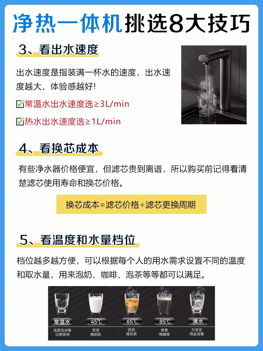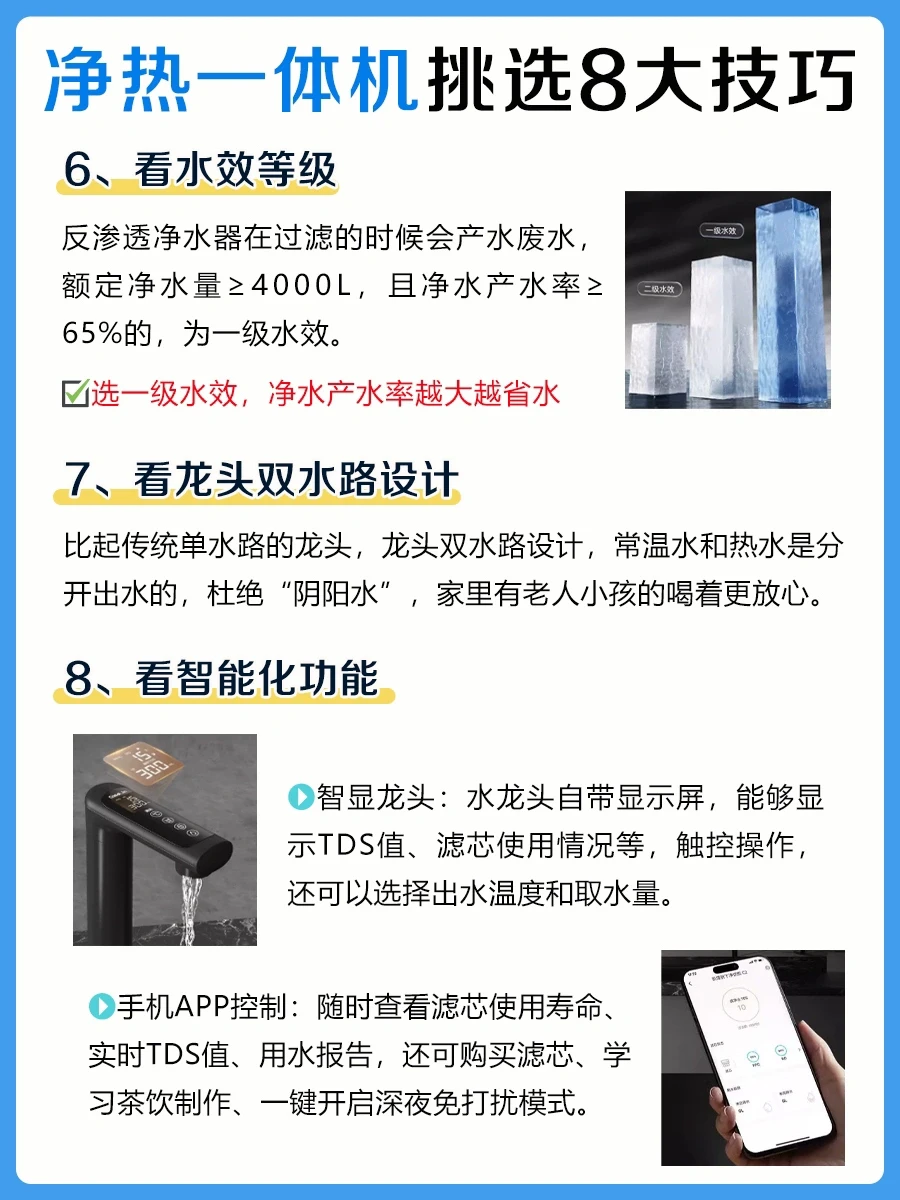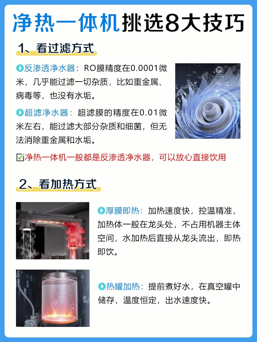 📝如何选购一台合适的净热一体机呢?整理了8大选购技巧,快来抄作业吧: