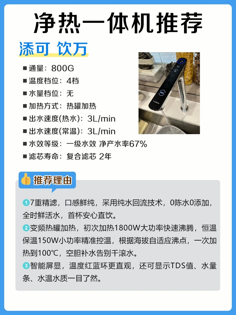 ✅选带智显龙头的,水龙头自带显示屏,能够显示TDS值、滤芯使用情况等,触控操作,还可以选择出水温度和取水量。