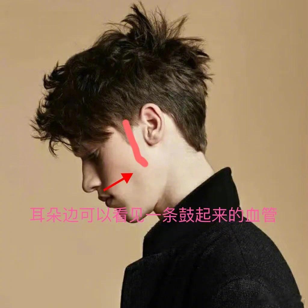 在和他聊天的时候,我注意到了他的右面部耳朵前,就是颞浅动脉和颞浅静脉的地方,有条静脉样的血管鼓起来,就像腿上的大隐静脉曲张的那种曲张静脉。