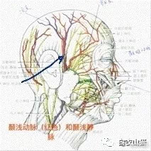 上面的图片,就是颞浅动静脉的解剖示意图。耳朵前面的面部皮下,就有这么两条血管,两者紧紧挨着。