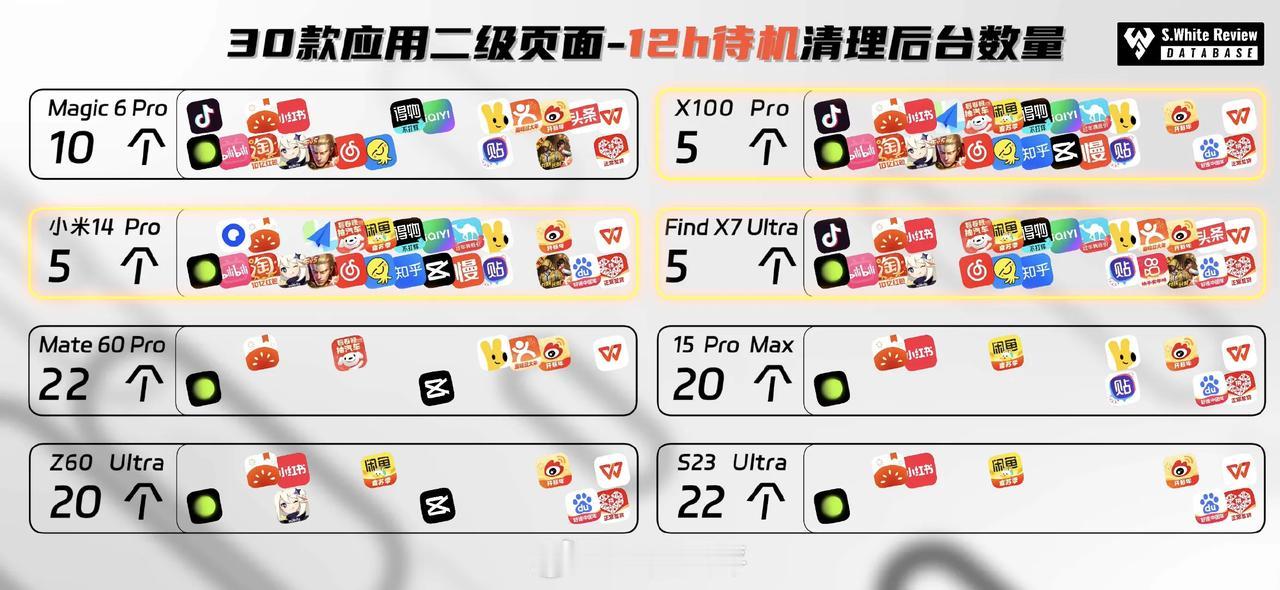 看了小白测评的杀后台情况测试,不得不说三星S24 Ultra和iPhone 15 Pro Max让人大跌眼镜,当然努比亚Z60 Ultra的表现也不行,不过对于这种二线品牌,再烂也无所谓。 综合下来排在前三的还是vivo X100 Pro,小米14 Pro和OPPO Find X7 Ultra,荣耀三个小时的表现很顶,但12个小时就不行了,只能放到第四了。 不过要说最让人意外的还是华为Mate 60 Pro,听晚上说鸿蒙系统那是各种遥遥领先,结果杀后台的表现也就那样吧,估计还是12GB内存的硬伤