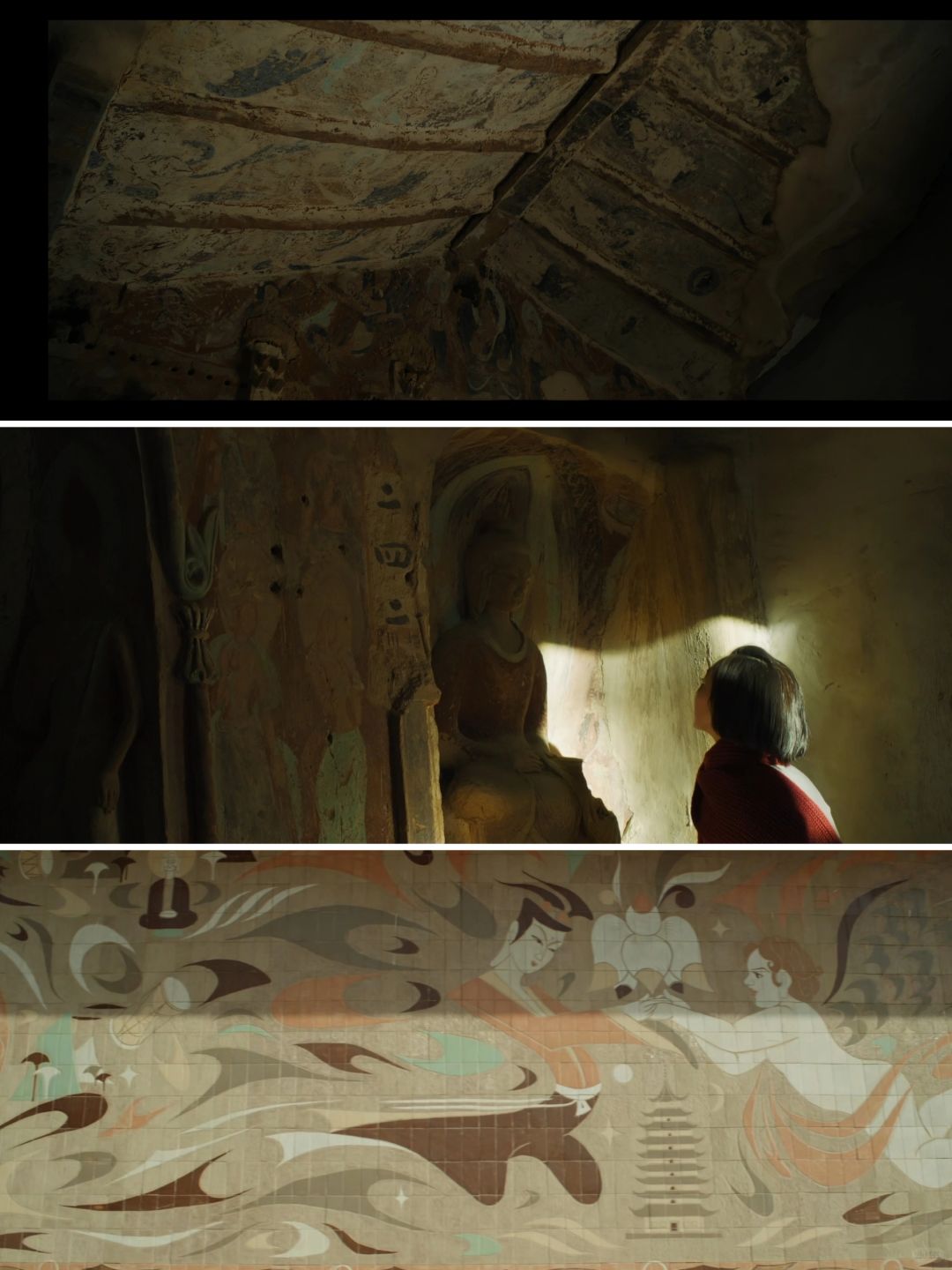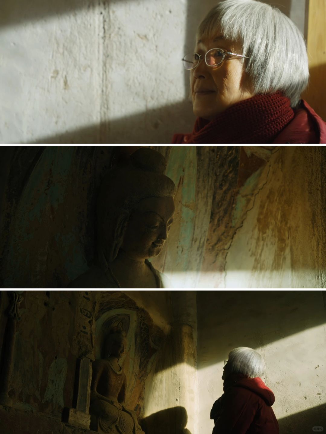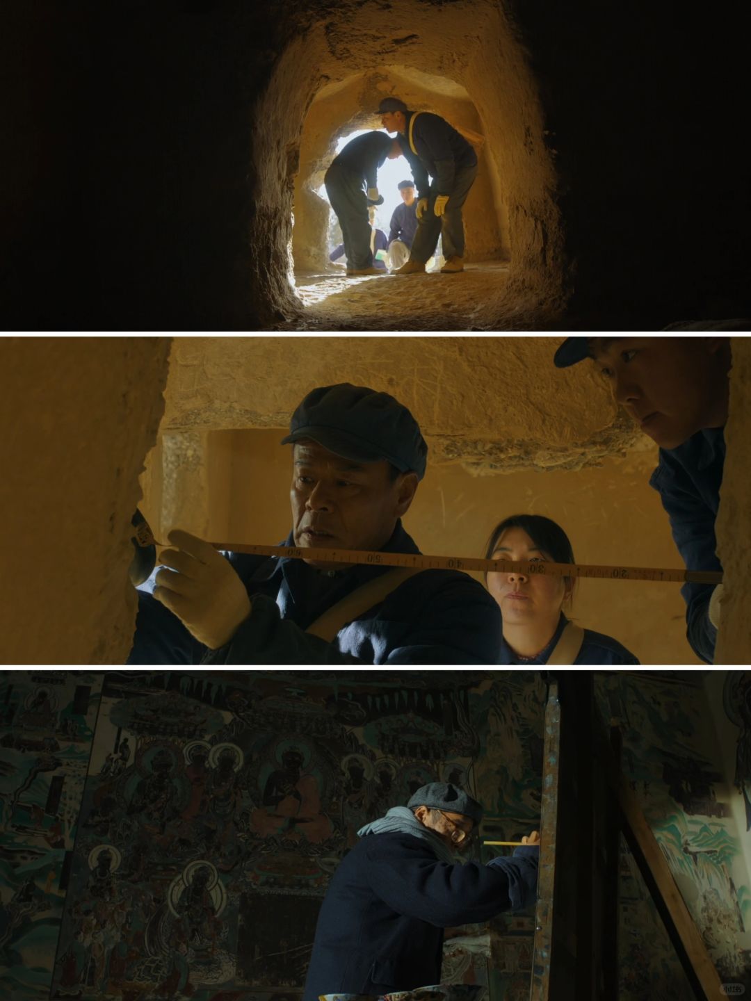 前辈们告诉樊锦诗,咱们经常进“洞子”的,要注意带护膝,因为阴潮,很多同事都有鼻炎,要经常擦鼻子。这个细节影片里确实呼应了,后期的樊锦诗确实有个习惯性的东西,擦鼻子。