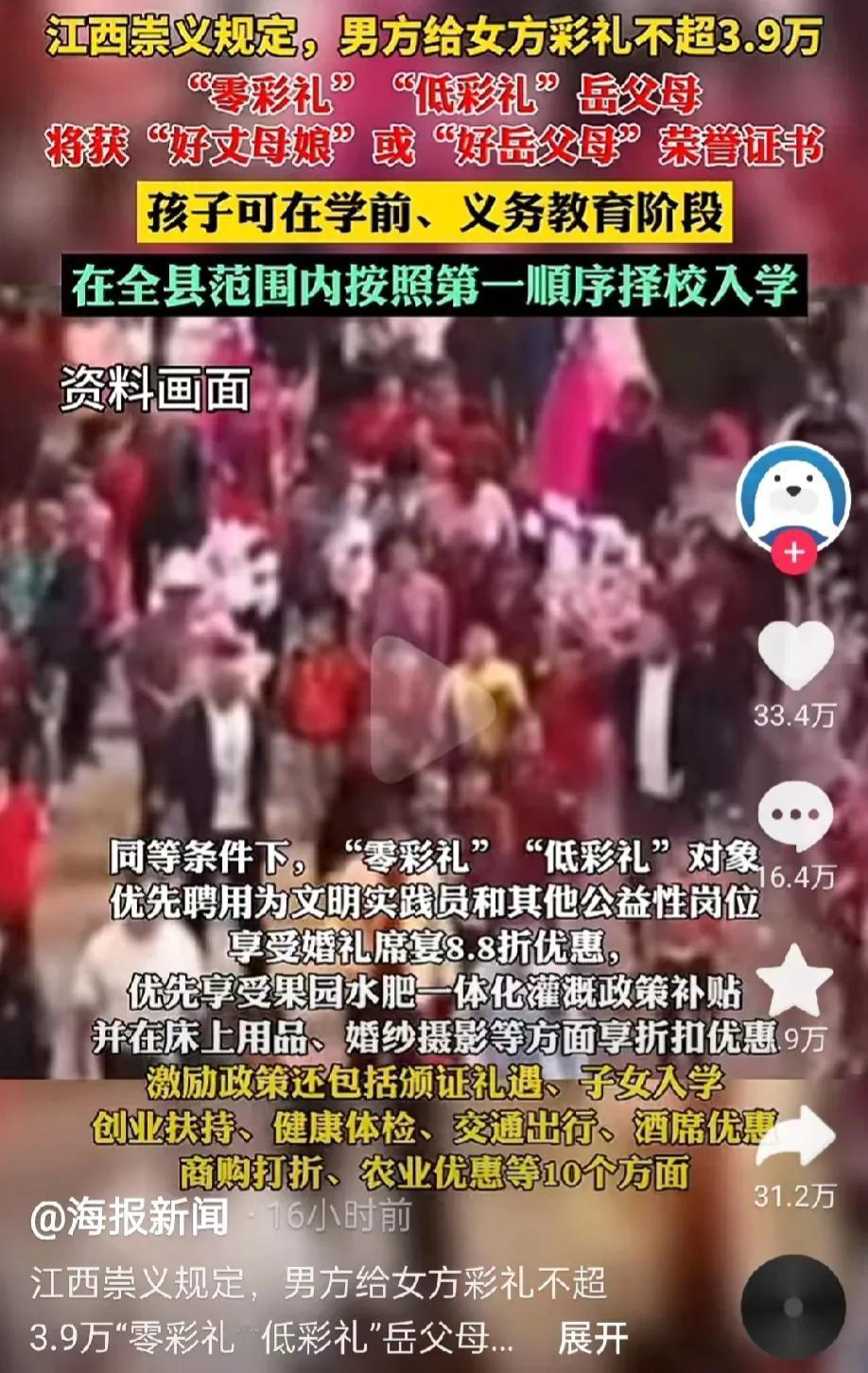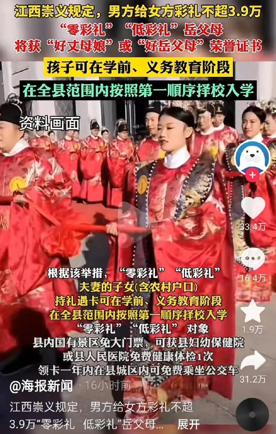 江西赣州,崇义县为了遏制高彩礼,出台了一个规定:只要岳父母不要彩礼的,或者彩礼低于3.9万元的,将获得荣誉证书,而且孩子还可以按照第一顺序择校入学,同时其他优惠政策也是多多的。