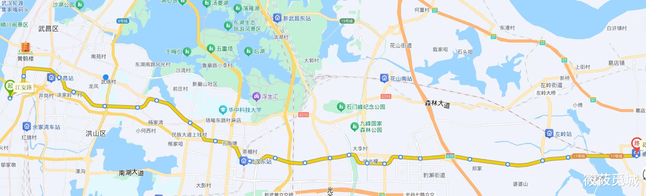 再比如,从虎泉到武昌站东广场之间只有马房山和丁字桥两站,但是与之平行的2号线虎泉到中南路这一段中间有3站,11号线与石牌岭路交汇没有设站。