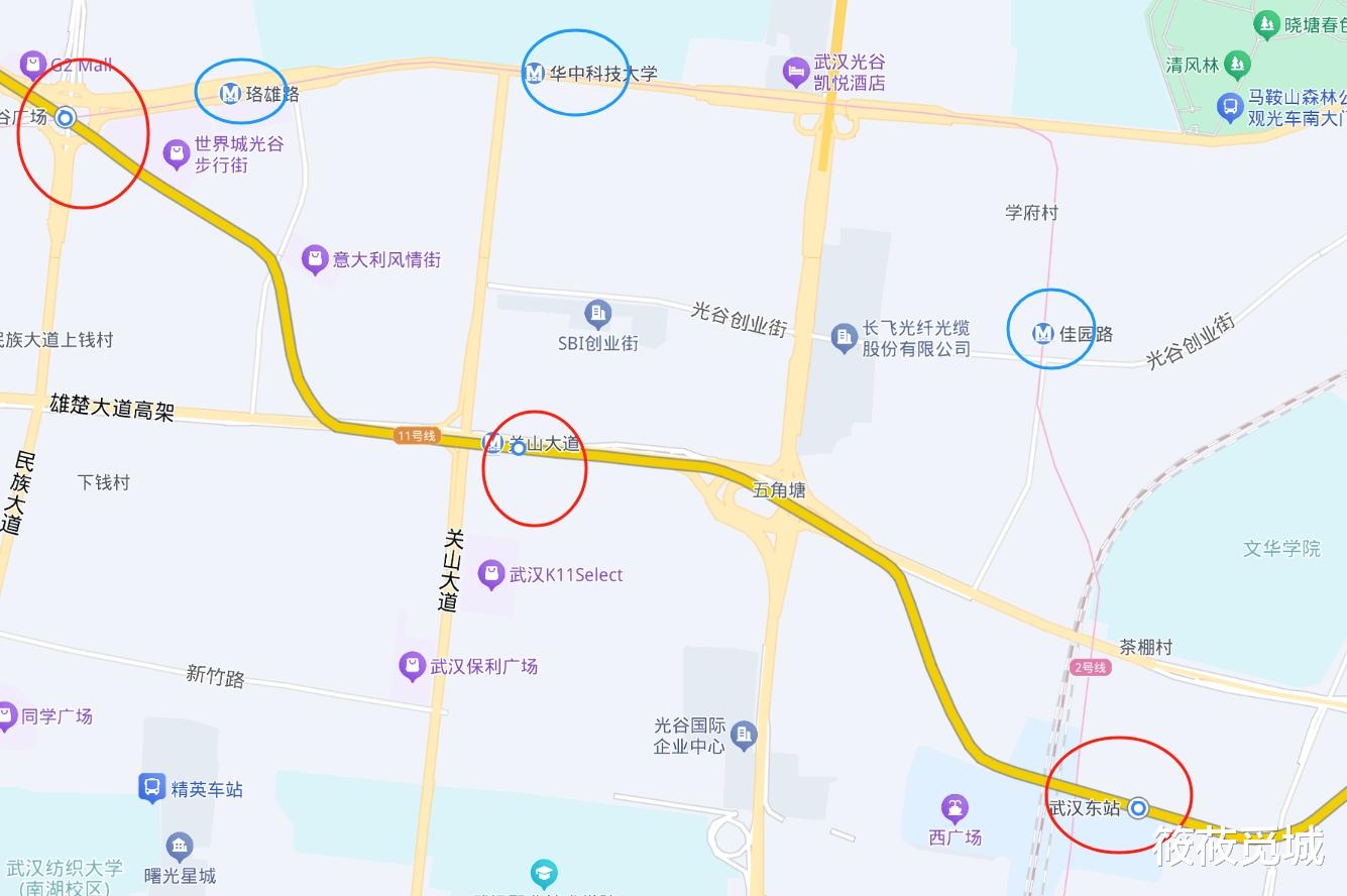 比如武汉东站到光谷广场这一段,2号线中间有3个站,但11号线只有1个站,11号线经过光谷大道、关山大道、珞雄路,但只在关山大道设站。