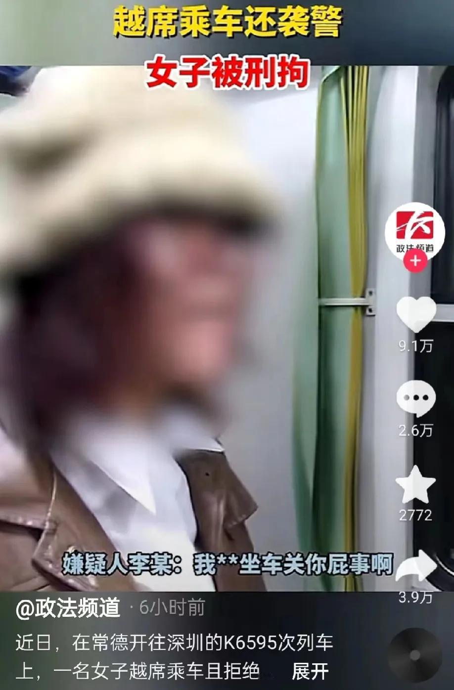 在常德开往深圳的K6595次列车上,一名女乘务员在查票。其中一名女乘客买的是无座车票,却进入卧铺区域。面对女乘务员的查票,女乘客很生气,怒骂乘务员。后来列车上的乘警过来了,女乘客还骂骂咧咧的。乘警要求女乘客离开卧铺区,女乘客大怒,殴打乘警。女乘客因为袭警罪被刑事拘留。