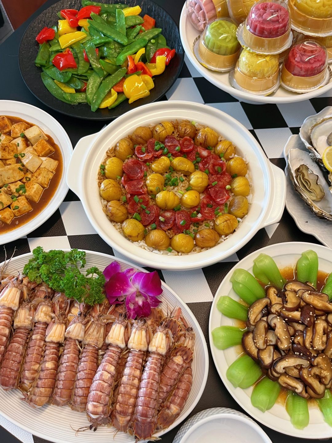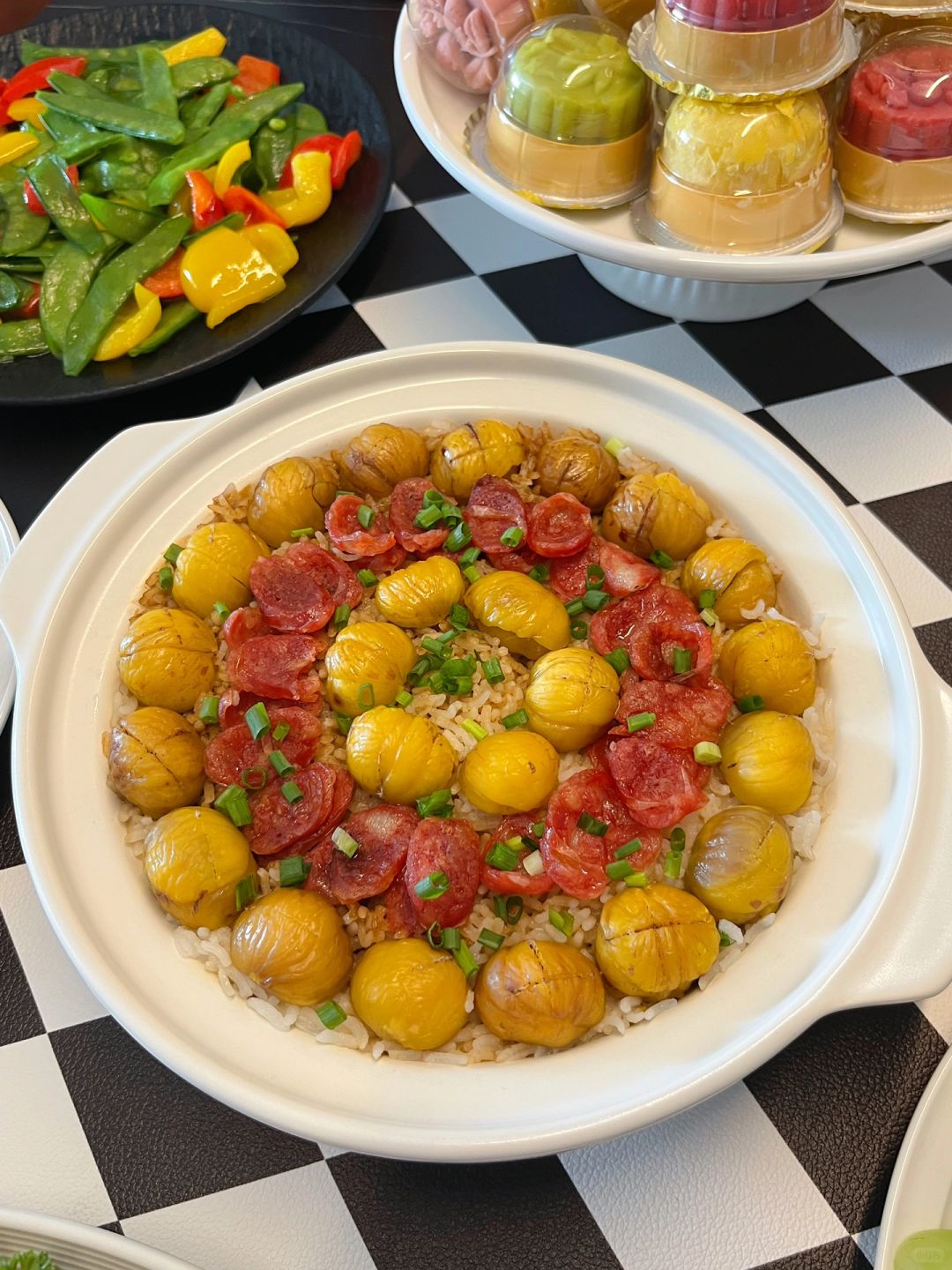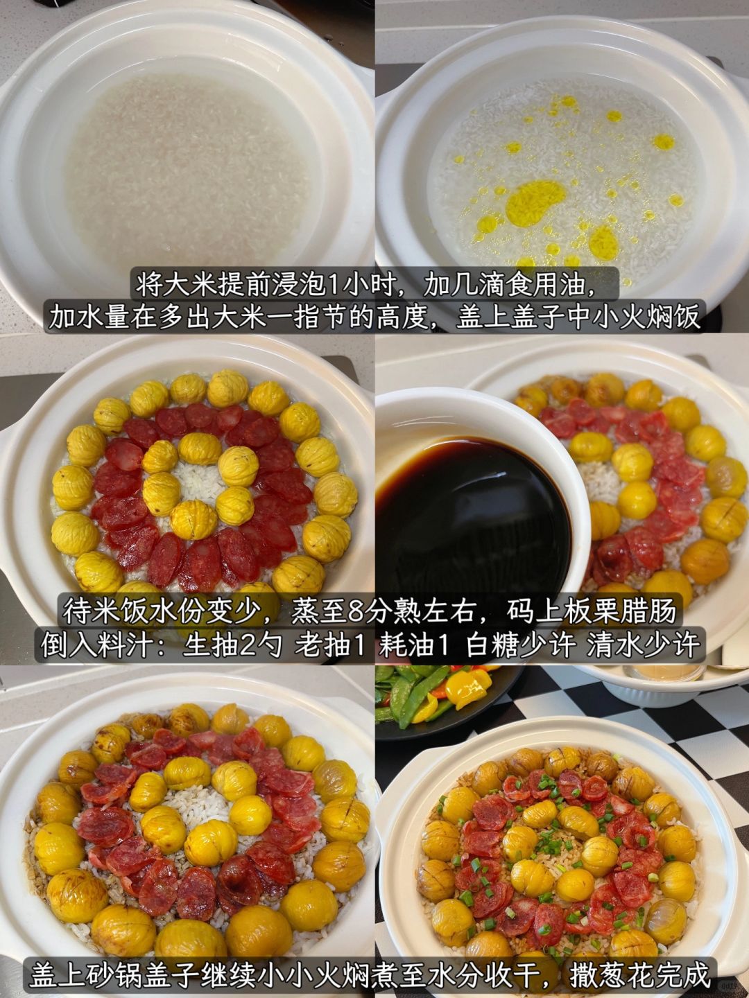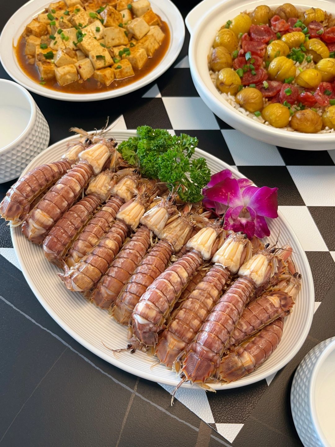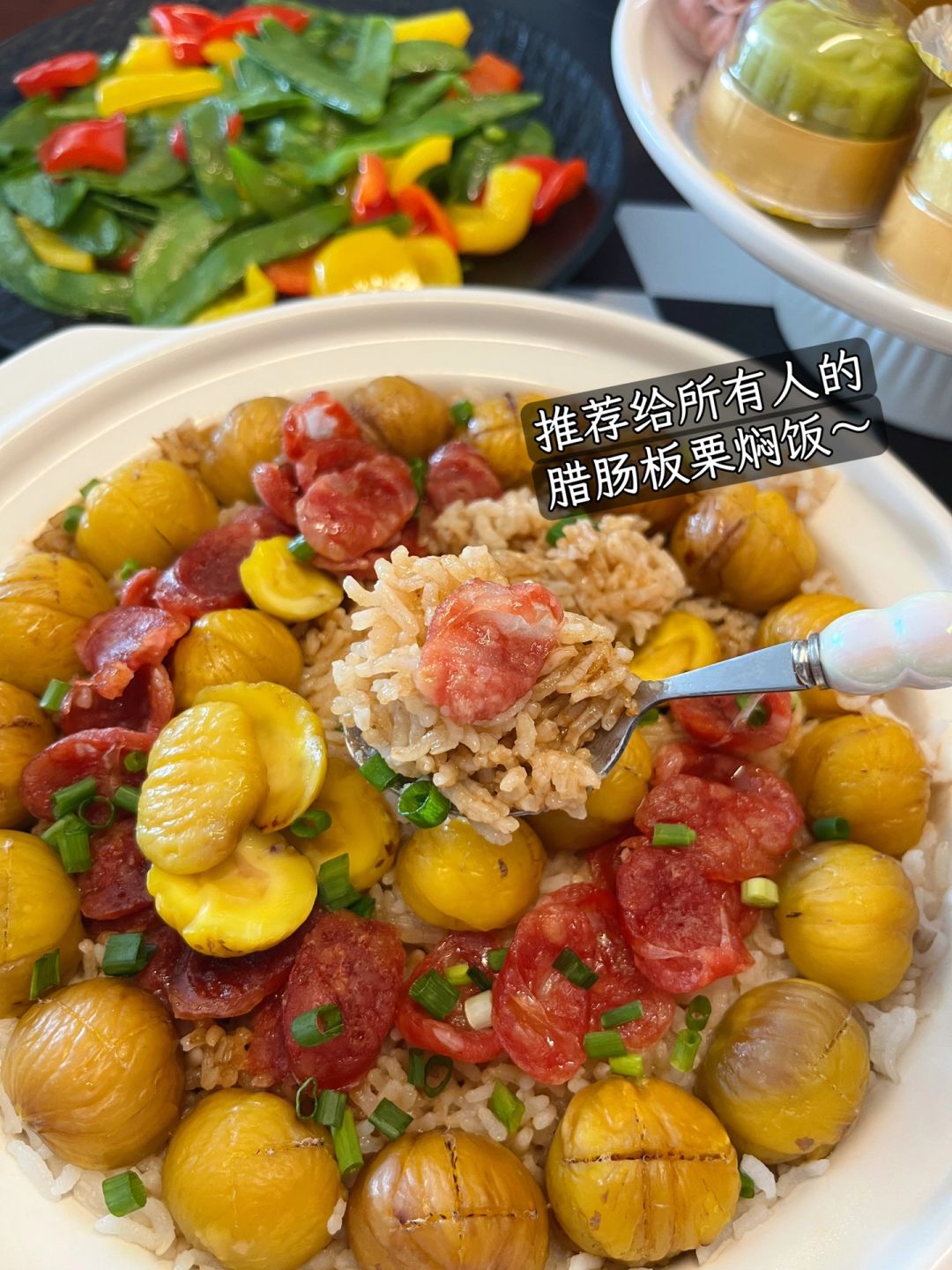 假期最后一天收收心,明天开始大家又变成了努力上进的小可爱~ 【今日美食分享】 [拔草R]板栗腊肠焖饭 [拔草R]水煮皮皮虾 [拔草R]麻婆豆腐 [拔草R]香菇油菜 [拔草R]芥末汁生蚝 [拔草R]彩椒炒荷兰豆 腊肠板栗焖饭:这个季节就是要吃软糯香甜的板栗呀~再配上腊肠太香了吧!上次的板栗吃完了,今天在家又剥了好多,剥好放冰箱可以冷冻起来,随吃随取。 水煮皮皮虾:将皮皮虾洗净,放入锅中加入料酒和姜片,煮开后继续煮 3 分钟捞出,冲洗干净浮沫即可食用~