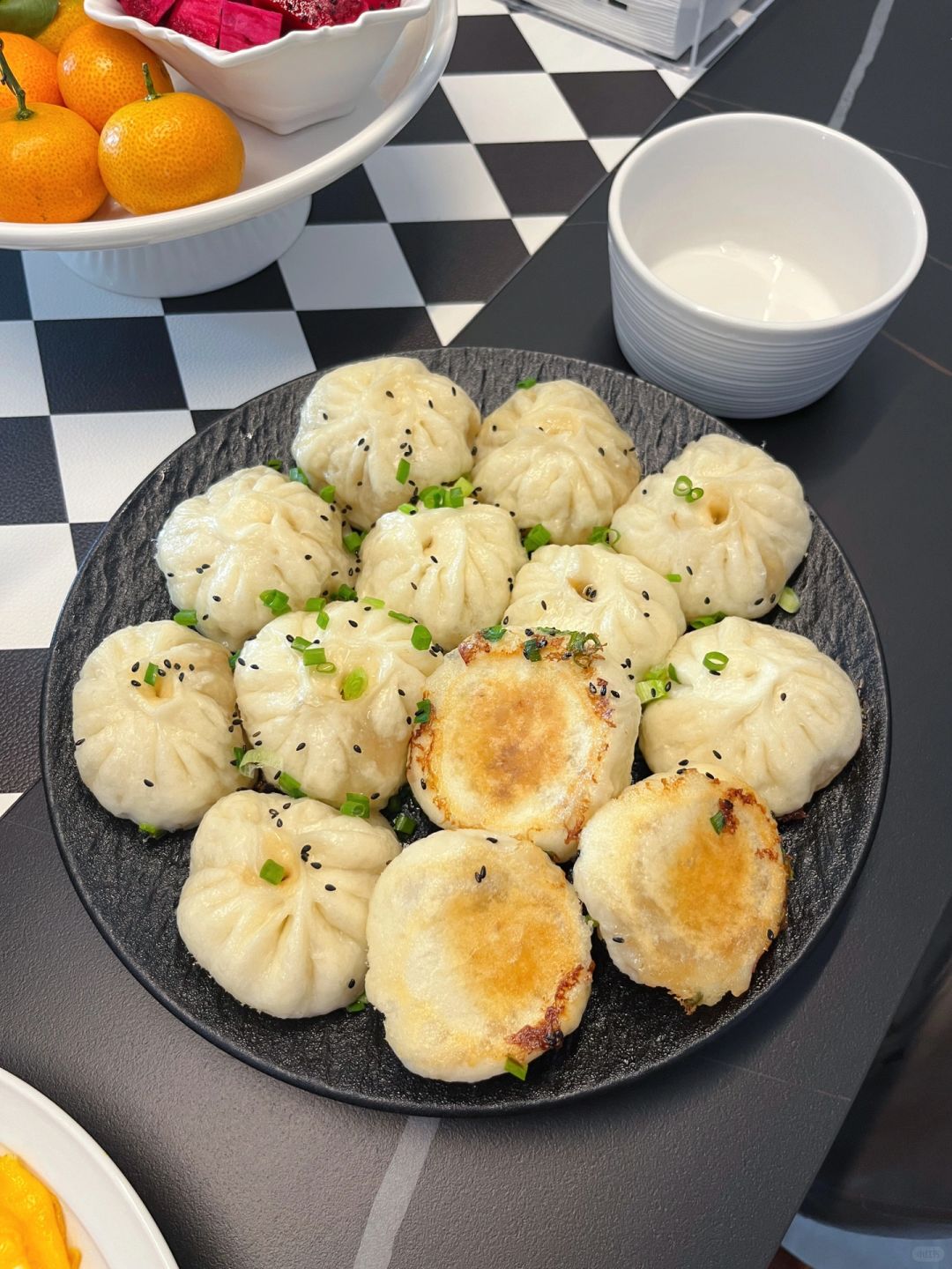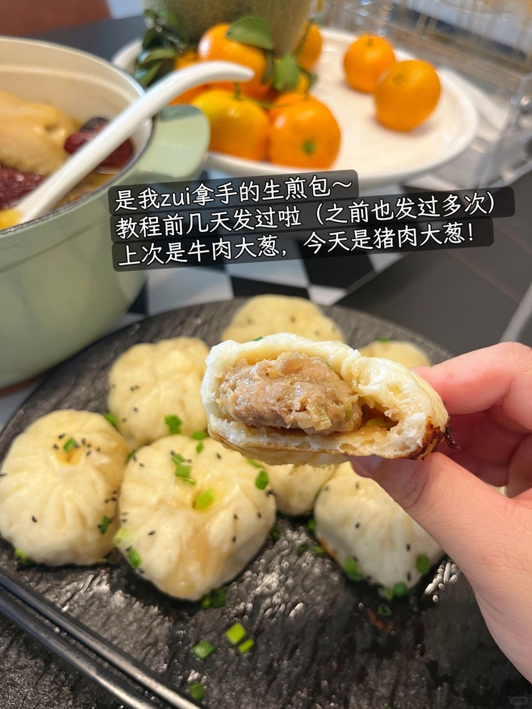 上次没吃够的生煎包今天又安排上了,今天的猪肉大葱馅一口爆汁~