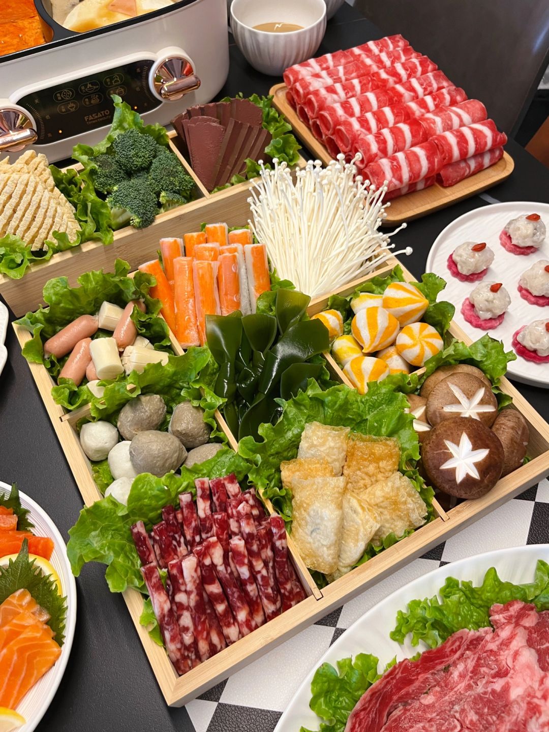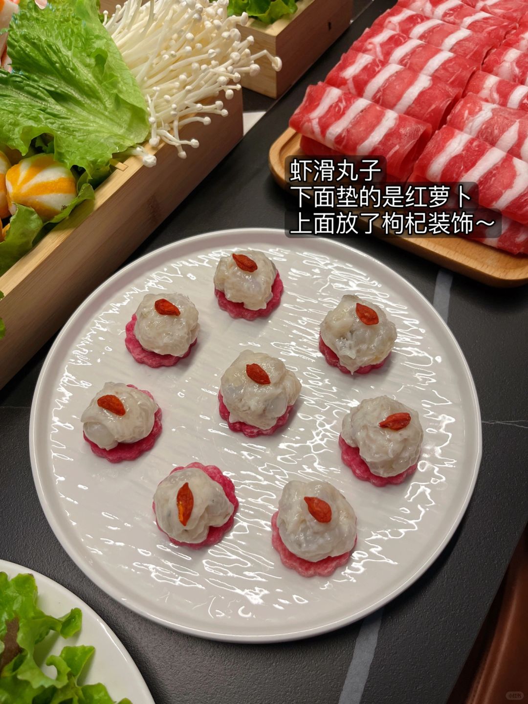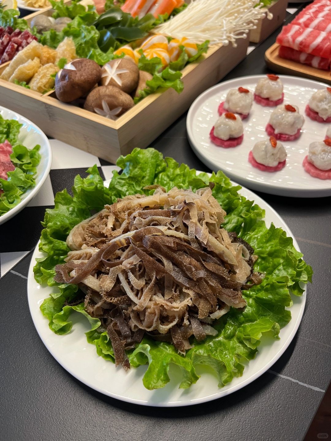 🥩荤菜:牛肉片 | 牛肉卷 | 肚丝 | 虾滑丸子 | 火锅小腊肠 | 响铃卷虾滑 | 鱼籽包 | 鱼丸 | 撒尿牛丸 | 亲亲肠 | 桂花肠肠 | 蟹棒 | 鸭血