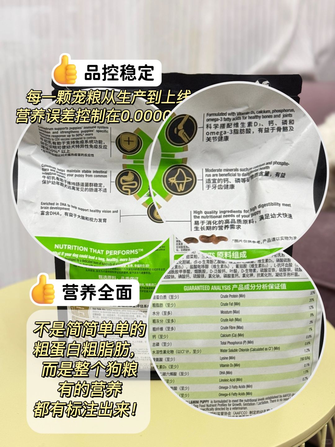 整体的营养也没有落下,包装背面印着超长的营养分析保证值表,这可是受法律监管的!充足的蛋白质加上DHA对大脑和视力发育有好处,钙磷比也合理,搭配维生素D,狗子的骨骼发育棒棒滴。营养稳定性也好,光是原料每年都有5100多道检测自主研发的生产设备把营养误差控制在0.000001以内,细节满分