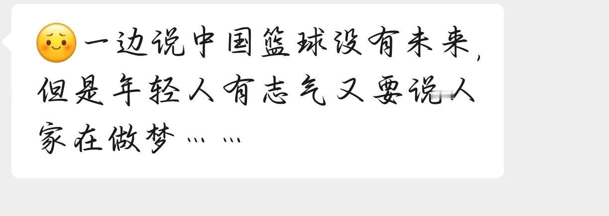群里一个球友说:一边说中国篮球没有未来,但是年轻人有志气又要说人家在做梦。 这是中国篮球迷的现状,无论咱们的年轻球员做什么,都是冷嘲热讽。 多点鼓励不好吗?即使失败了,又怎么样呢?至少也是付出过努力的? 我搞不懂其中的逻辑。 #说两句中国男篮# #中国篮球# #CBA联赛# #中国男篮#