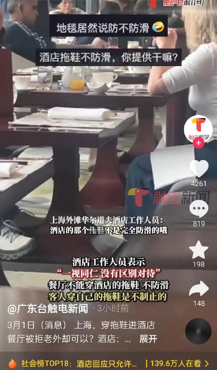 “崇洋媚外到极致!”上海,一男子入住五星级酒店,穿着酒店拖鞋来到用餐区。不料酒店工作人员不让男子进,说,会影响客人用餐。可是,接着一名外国人穿着人字拖,大摇大摆的进入酒店用餐。男子觉得受到了歧视。酒店回应道,允许客人穿自己买的拖鞋进入用餐,但是穿着酒店的拖鞋则不允许。