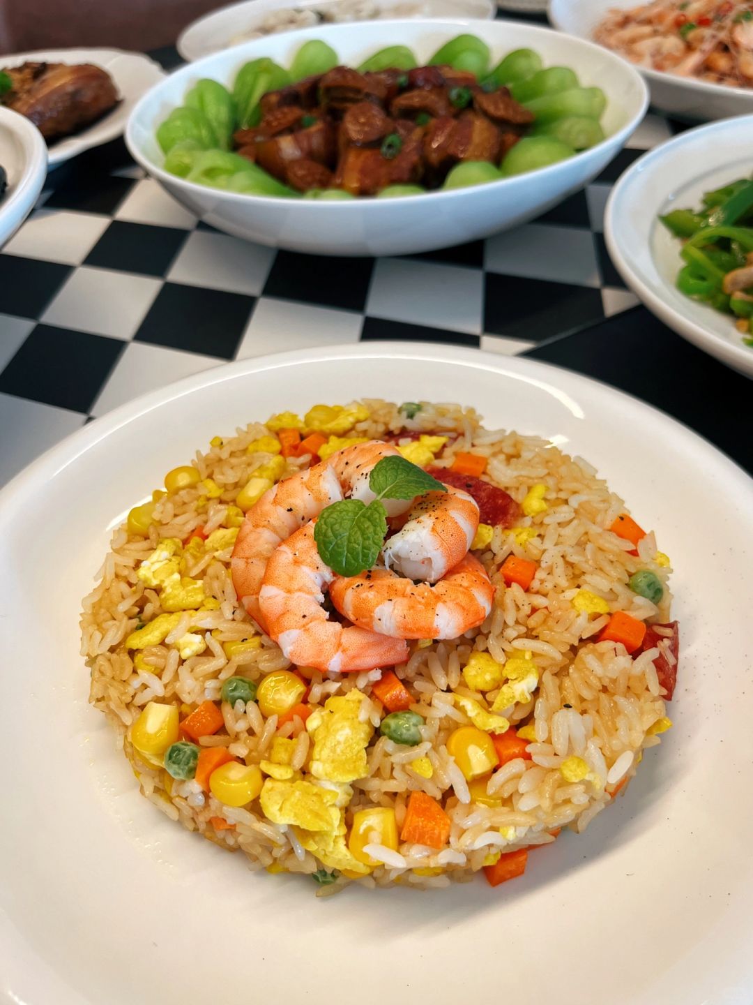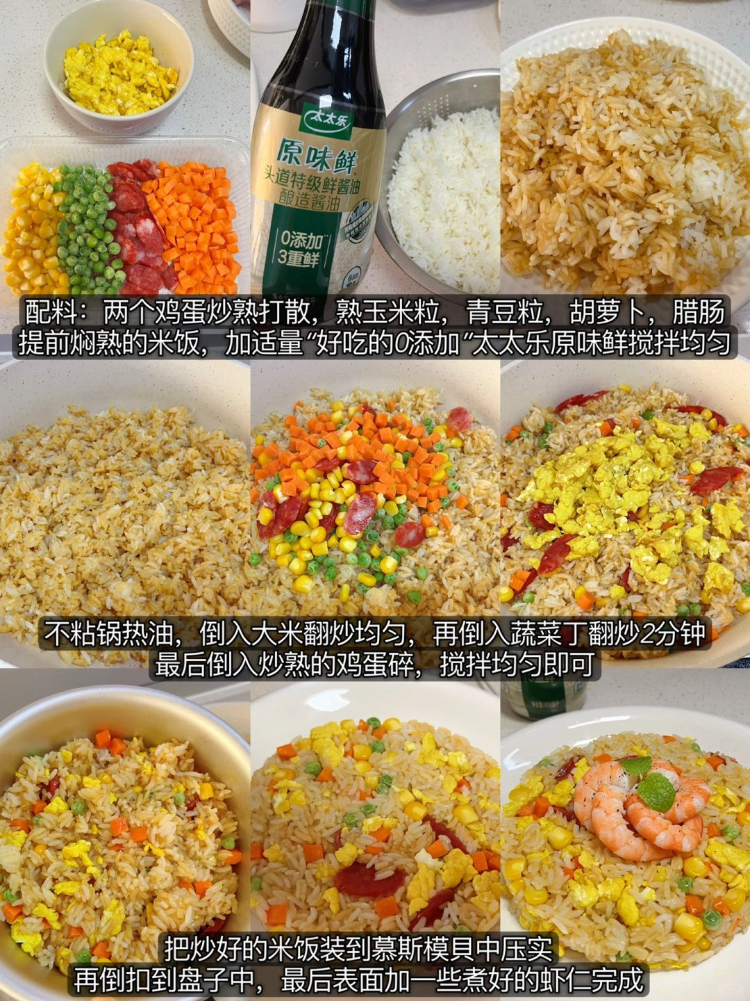 4️⃣超好的米饭装到慕斯模具中按压紧实倒扣到盘子中,再煮一些虾仁放到上面即可(不用模具做造型,直接装碗也可以哈~好吃的酱油炒饭轻松搞定)