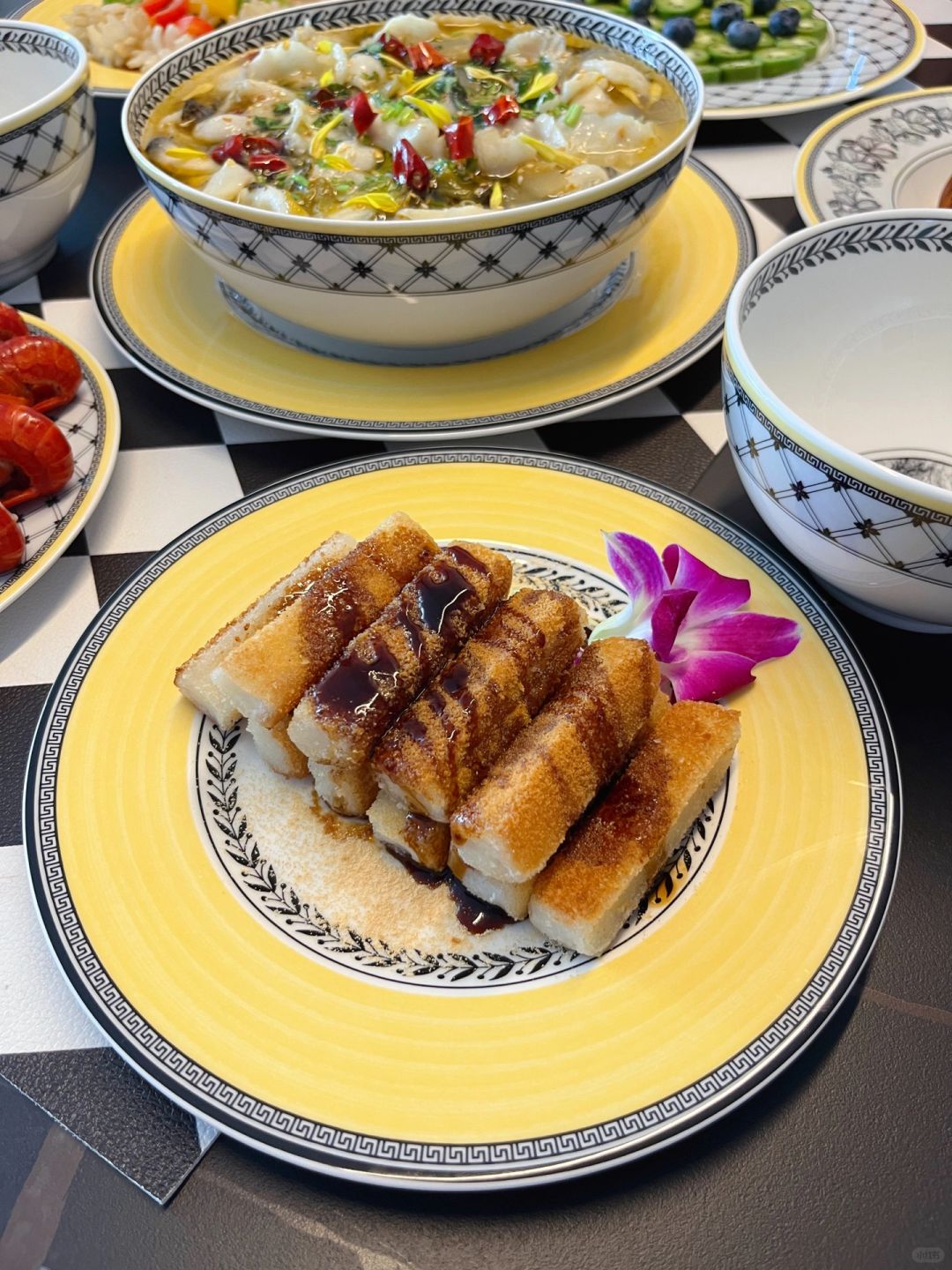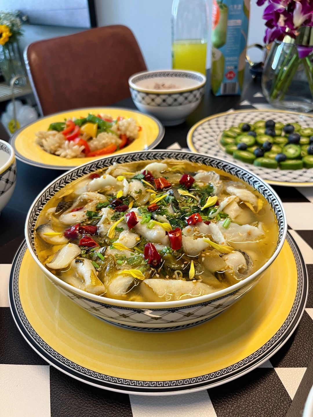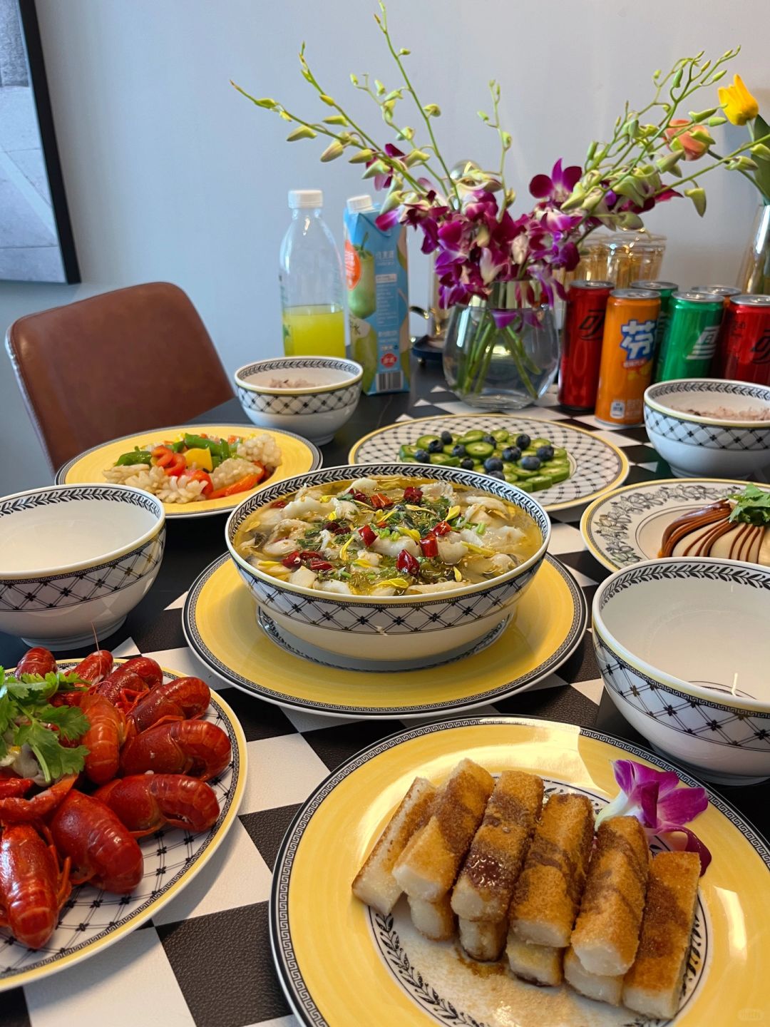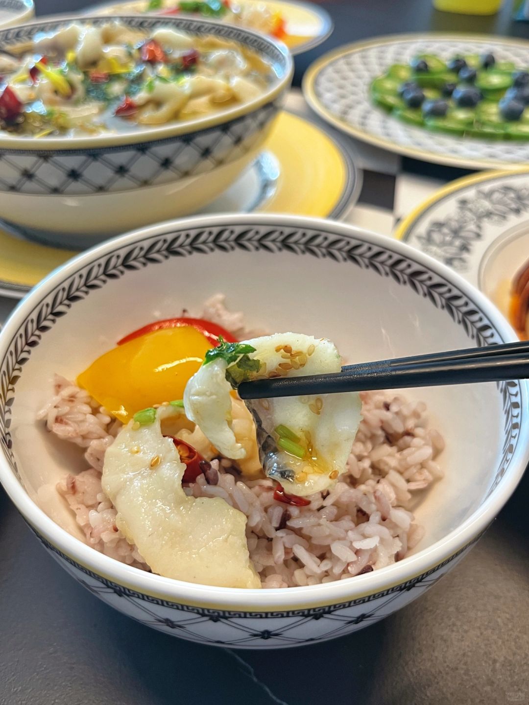 姐妹:财神不渡怨妇,心宽福自来,所以都要开心起来呀~ 【今日美食】 1️⃣酸菜鱼 2️⃣彩椒爆炒鱿鱼卷 3️⃣蒜香小龙虾 4️⃣红糖糍耙 5️⃣红油拌鸡蛋干 6️⃣水果:奇异莓,蓝莓 [气球R]龙虾季快过了,珍惜这最后吃小龙虾的机会~ [气球R]酸菜鱼也是我家每周都做的一道菜,酸爽开胃很是下饭,配菜根据自己喜欢随意添加~ [气球R]好看的餐具也是我下厨的动力,就算拥有了再多,看到喜欢的我还是会毫不犹豫的下手入~今天的餐具岂止是喜欢啊,简直就是艺术品,我可太爱了!