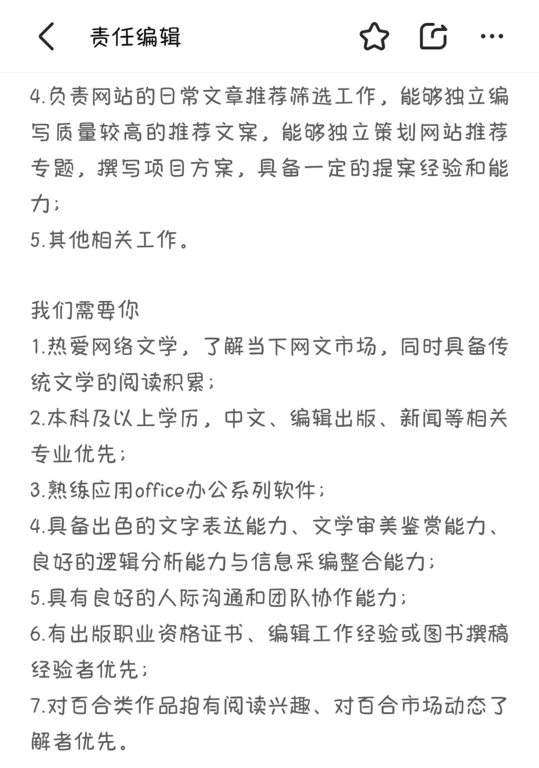 今年年初,晋江刚招了一个新的现言编辑👁 现在三月份开春,长佩也开始招责编了,不过招的是百合编辑[暗中观察R] 月薪1万到1万5[吃瓜R]