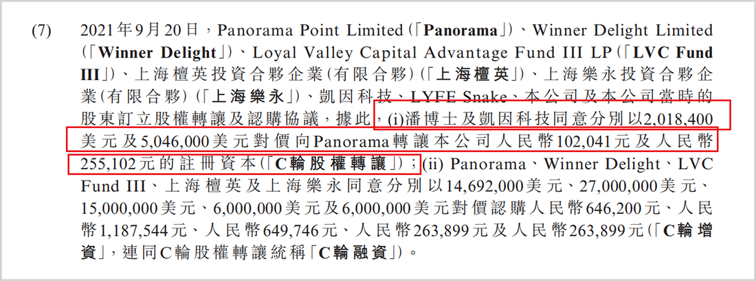 招股书显示,2021年9月,潘海、凯因科技分别以约201.84万美元、504.6万美元的价格向Panorama转让所持先为达生物的部分股权。随后的2023年,潘海继续减持,分别向林芝永正、苏州湃益转让股权,作价分别为1041.88万元和446.52万元。
