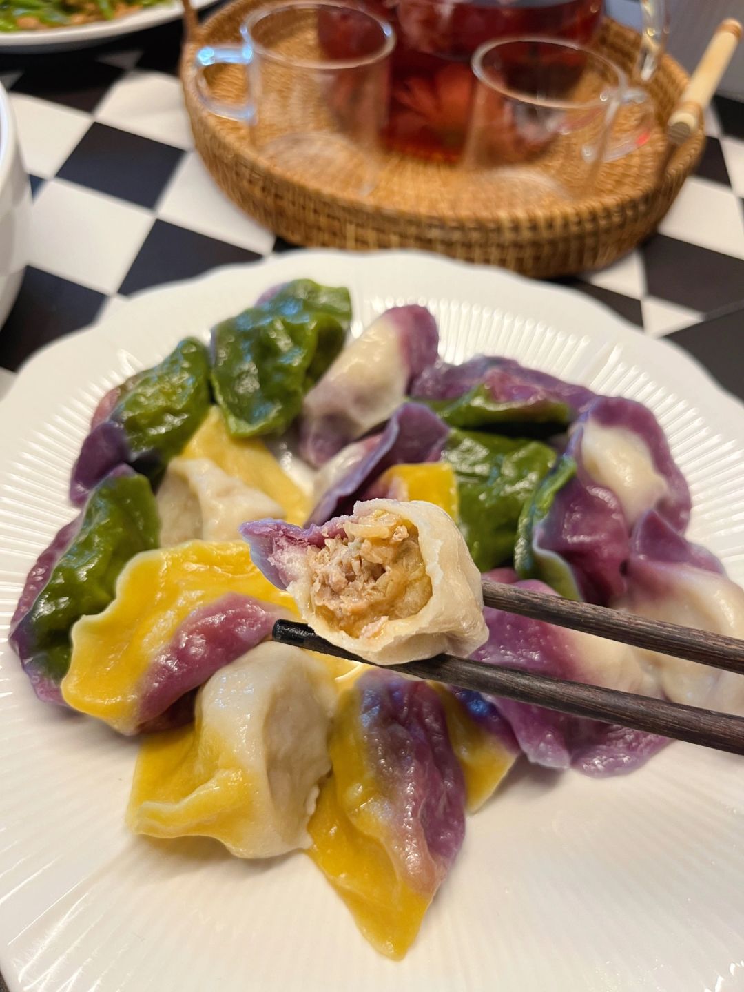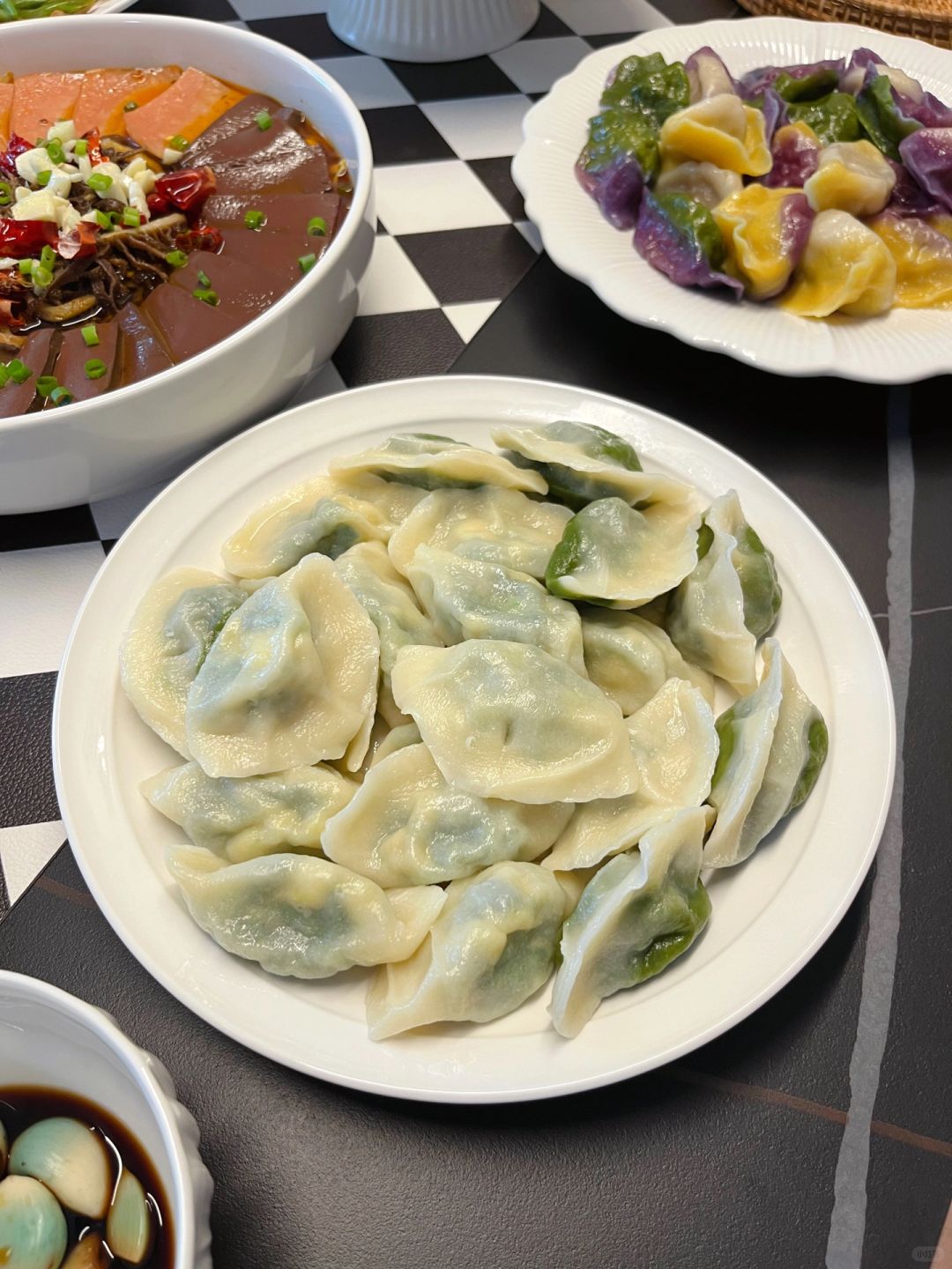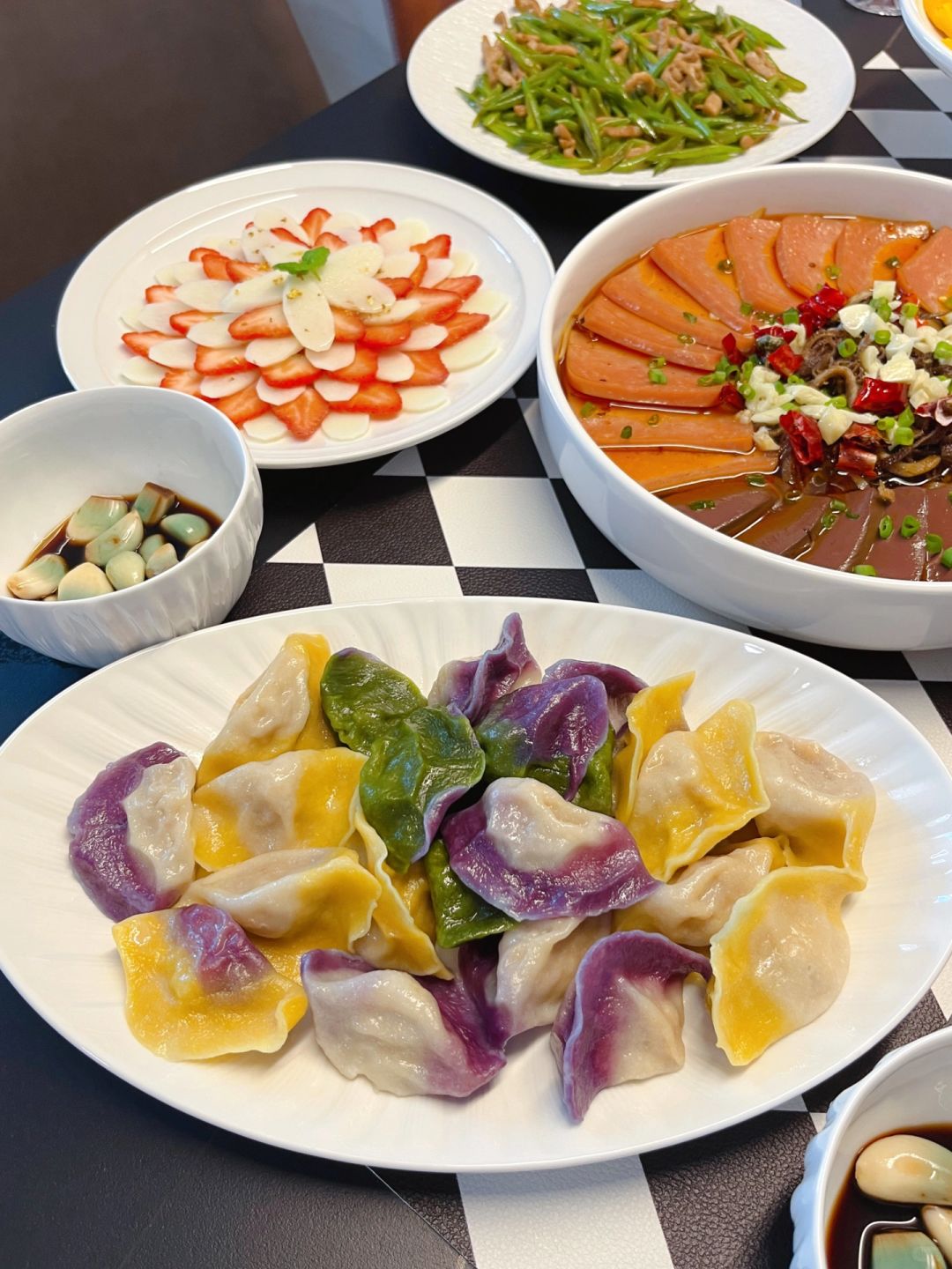 北方人冬至当然要吃饺子啦🥟~ 记得吃一碗热气腾腾的饺子呀~ 【冬至菜单:】 🌈彩色水饺 🥟猪肉大葱饺子 🥟韭菜鸡蛋饺子 🍲毛血旺 🍓草莓山药 🫘四季豆炒肉丝 五彩缤纷的饺子寓意美好~愿所有人万事胜意,幸福安暖❤️