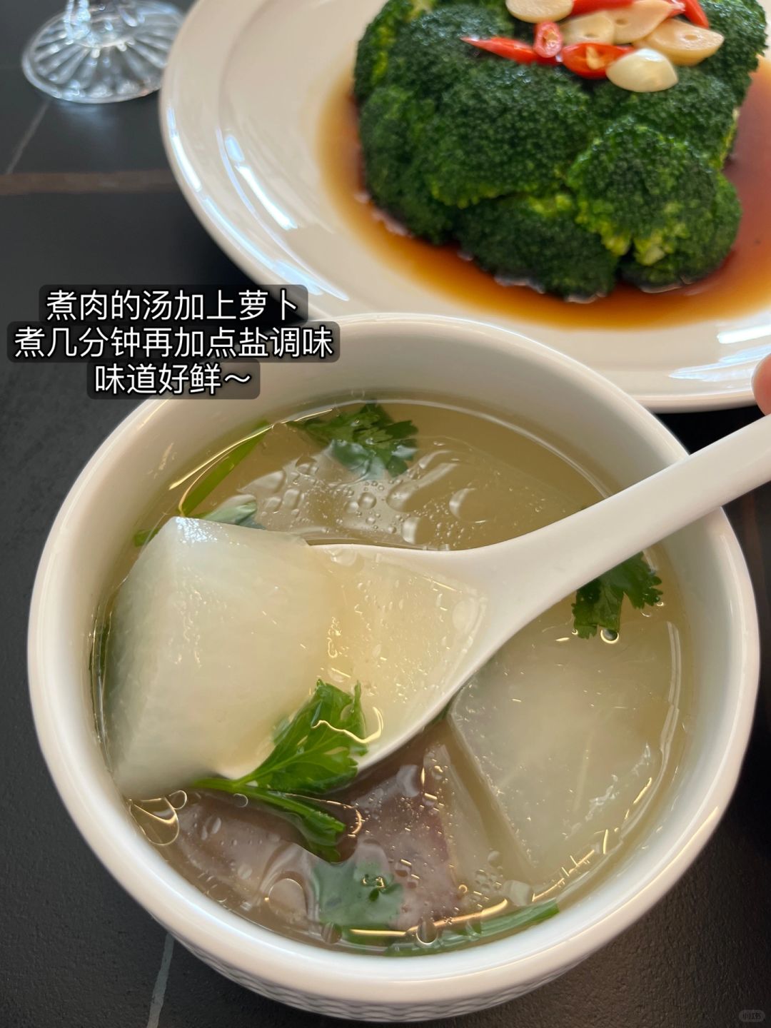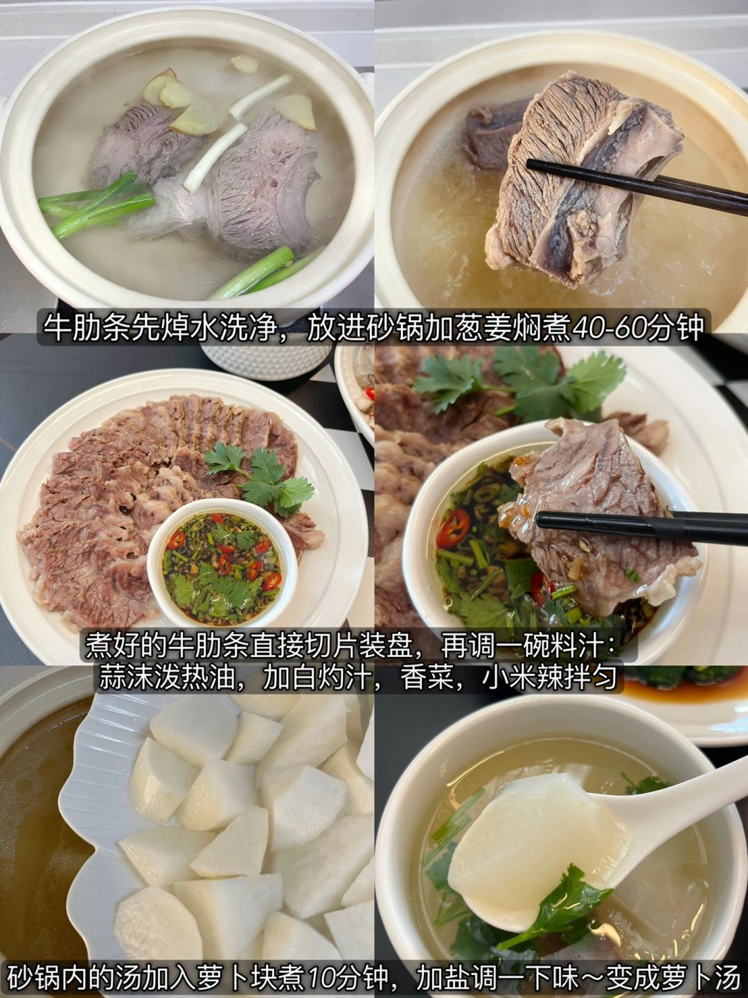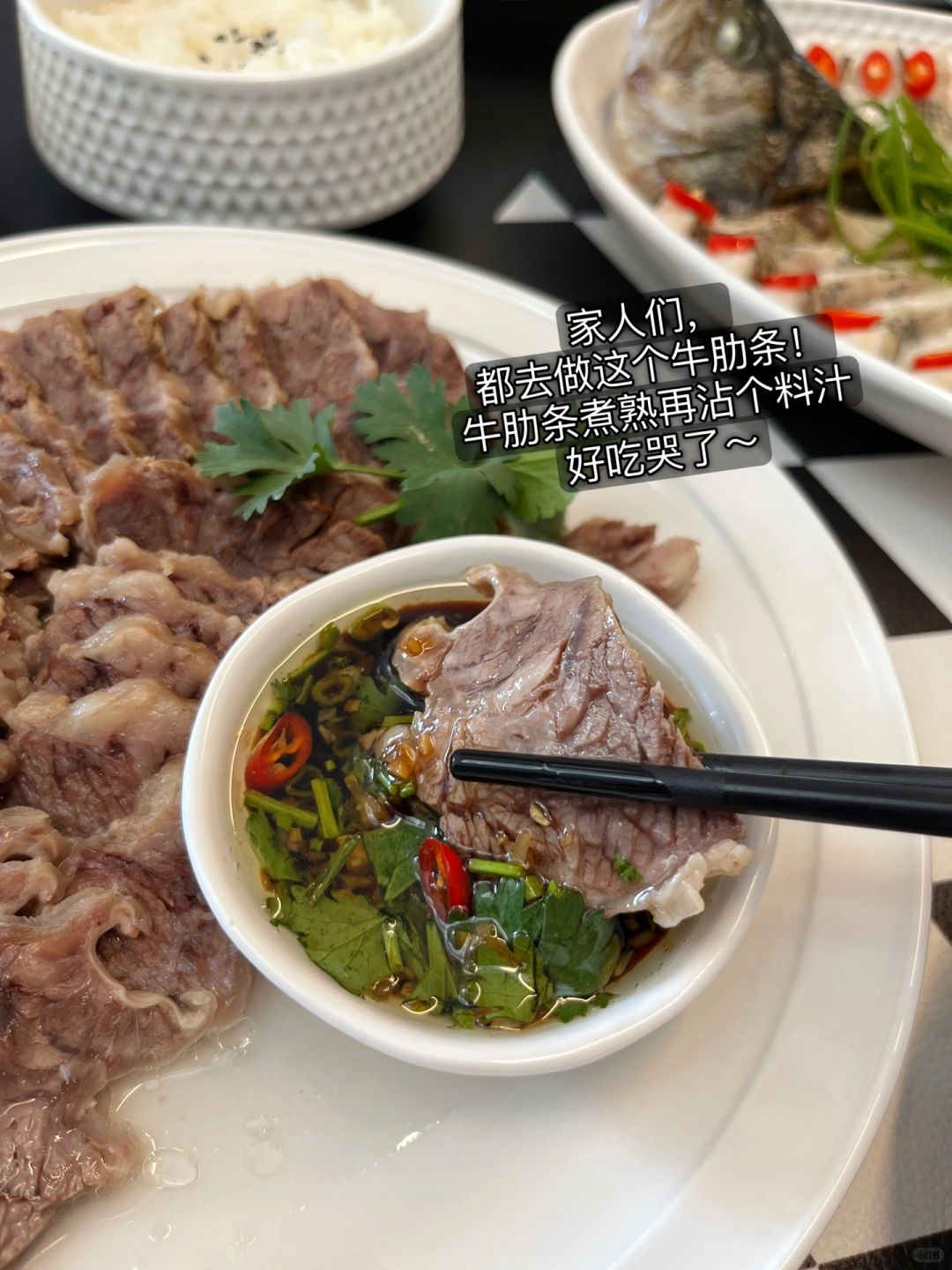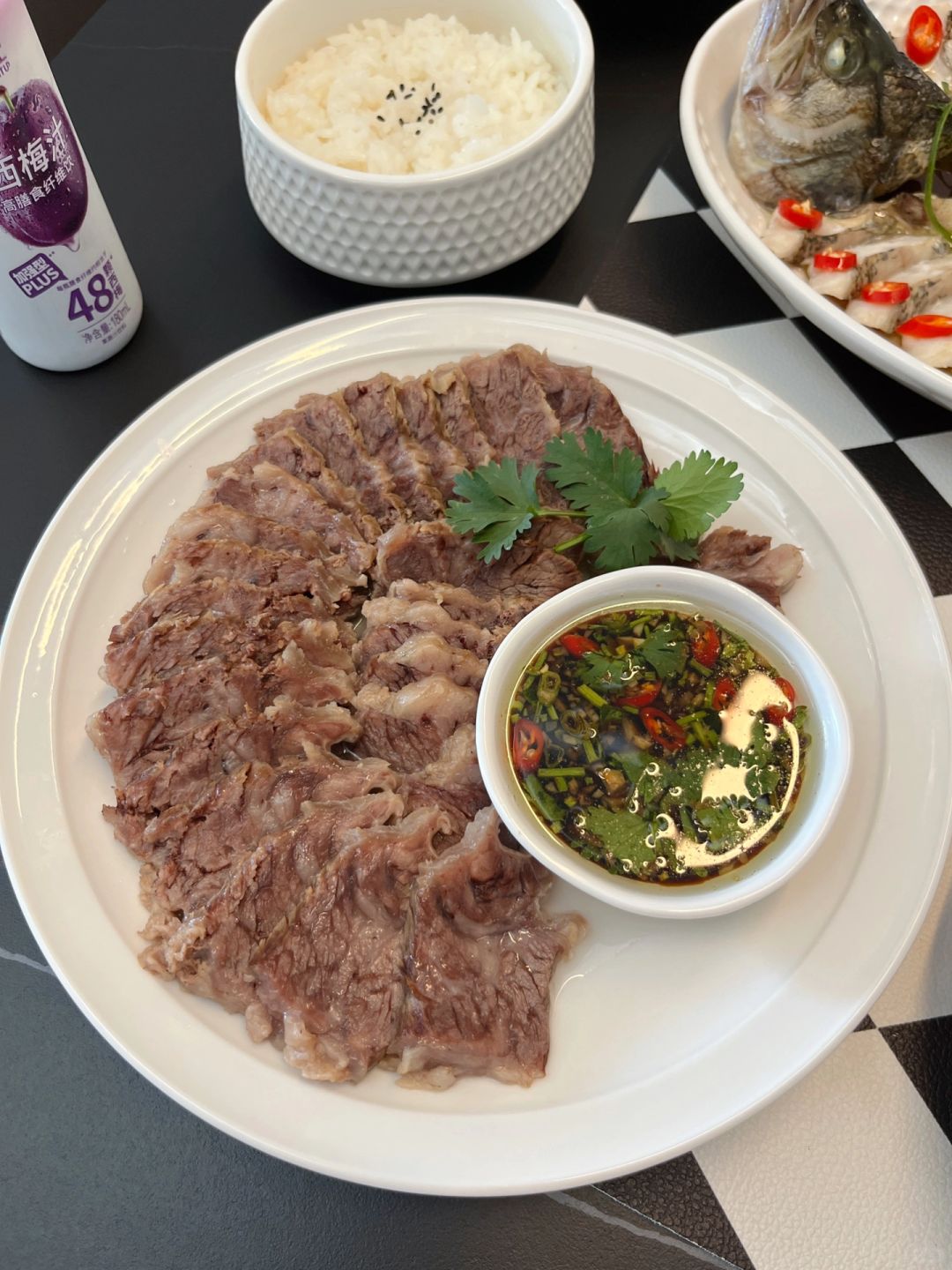 [拔草R]白切牛肋条真的好好吃,我这一盘是一斤的量,做法也简单,葱姜水把牛肋条煮熟,再调个蘸料就可以,另外煮牛肉的汤留着,加点白萝卜块煮熟,最后撒点香菜,盐调味,就变成了萝卜牛肉汤,很是鲜美~大家快试试吧!
