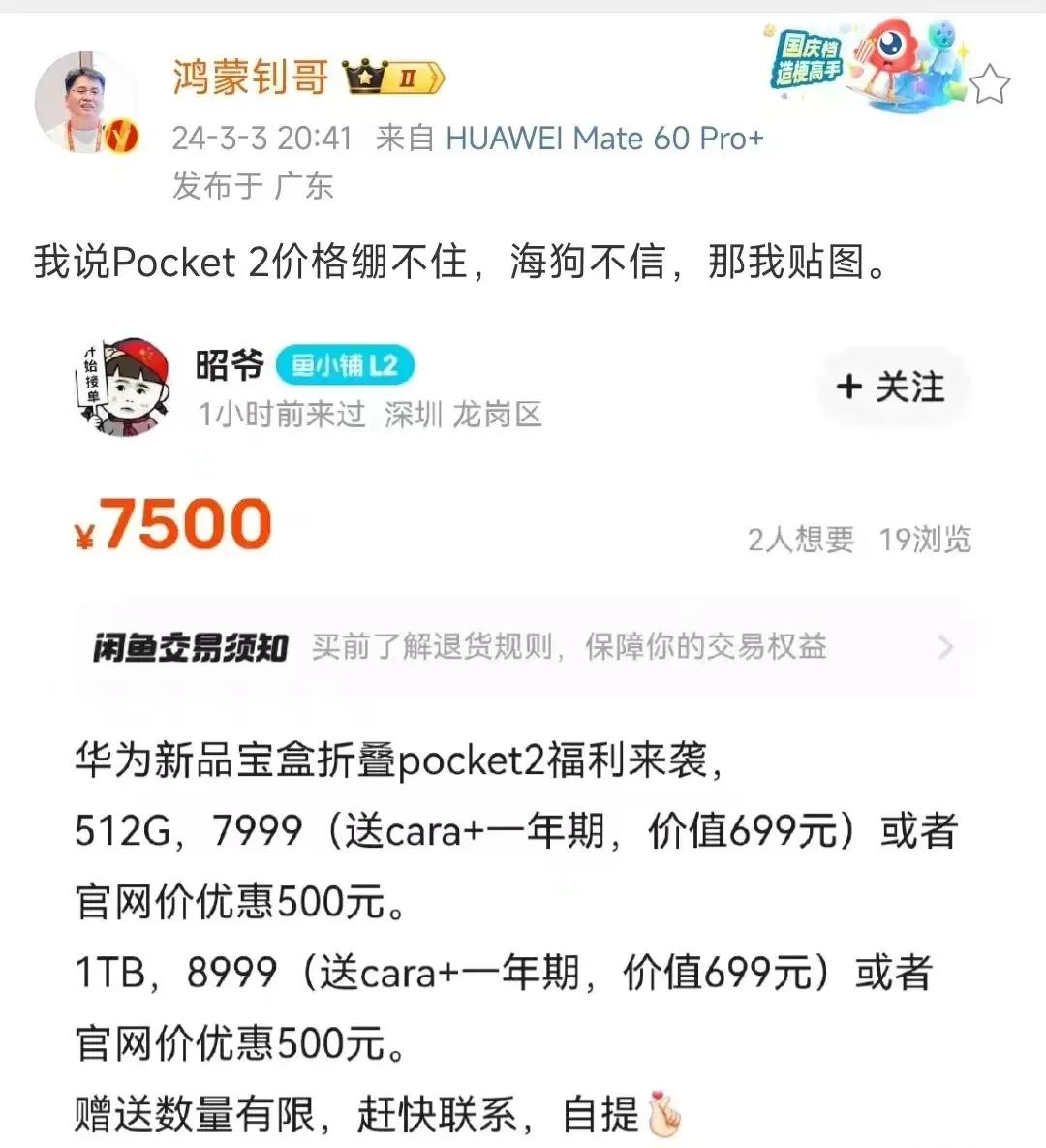 鸿蒙钊哥说华为pocket 2的销量不行,也出现了降价,这就有点意思了,然后去看了下所谓的证据,这不就是常见的套现吗?小米14 Ultra和iPhone 15发布后,也是一堆套现的,价格比官方优惠几百,这种基础操作真不知道有什么好说的,还是那句话,华为手机遇到这个操作是套现,小米和苹果遇到了就是产品力不行,只能降价,这种大是大非的问题,怎么可以犯错误呢?