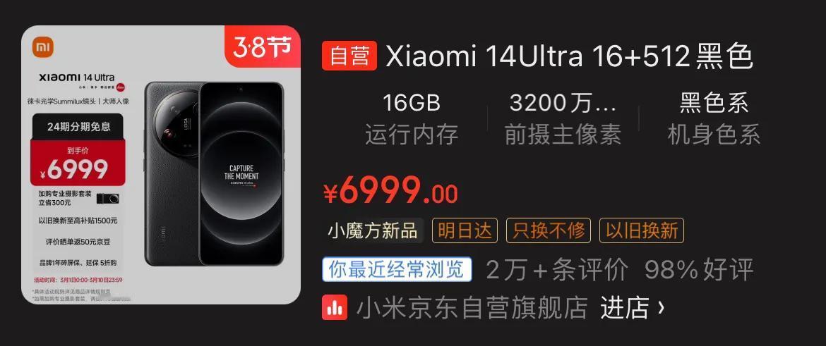 当初就说过华为pocket 2和小米14 Ultra不会有什么交集,看看二者在京东的评价数量就一目了然了,相差非常明显,这说明二者的主战场不在一个地方。 Xiaomi 14 Ultra的这个数据,足以说明这次的市场表现强于上代,更加受到消费者的青睐,个人看来主要还是Xiaomi 14 Ultra做对了这几件事情,让产品更完美更有吸引力。 首发自然是内在的提升,带来了更好的性能表现,屏幕,影像,续航和周边,特别是影像部分的大师人像解决了人像的短板,双长焦都支持微距功能,主摄加入了无极可变光圈,整体的可用性无疑更高了。另外续航部分也要赞一个,这次的续航提升感知比较明显。 外在的提升也很关键,正面的全等深微曲面屏,颜值和手感都更高了,背部去掉了溜背设计,整机配重也有调整,不再头重脚轻了,手感也更好了。 总之最近学了个新词叫黑子严选,这次Xiaomi 14 Ultra算是通过黑子的严选了[吐舌]