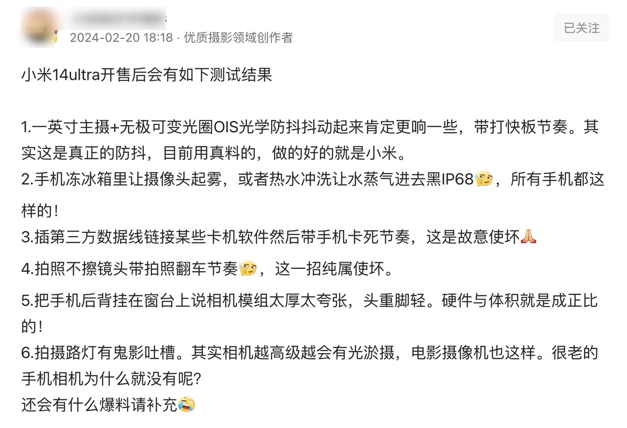 不得不说,网友对黑子严选的预判很准,产品还没有发布的时候,就已经将各种带节奏的套路给指出来了,看他们折腾了这么久,结果Xiaomi 14 Ultra的销量依旧非常火爆,JD上面的评价数量2W多条,比他早发布一大截的竞品评价才1W多条,这说明了啥? 这说明在绝对的实力面前,带节奏是没有用的!这个机器的提升从上手的那一刻就可以感知,全等深微曲面不仅仅带来了更好的正面观感,上下左右滑动的手感相比传统的双曲面屏也更好了,背部的设计也更加在线,而且机身的配重更加优秀,没有头重脚轻的情况。 影像部分,体验下来三点提升很明显,首先就是大师人像名不虚传,其次就是双长焦微距,最后就是5X潜望长焦的表现更好了。续航也是亮点所在,金沙江电池的加持下续航明显更强了。周边方面,卫星通信这些旗舰必备的功能也给了,并且还首秀了自研T1芯片,带来了更好的通信能力。 不过黑子严选是不会收手的,只是现在的网友也不傻,已经熟悉了黑子严选的套路,直接表示这是最搞笑的关于黑Xiaomi的回复,所以在这里真诚的建议黑子严选别围着这款产品闹腾了,在绝对的实力面前,这些小伎俩能忽悠谁呢?除了XX共振,还能起到啥作用?