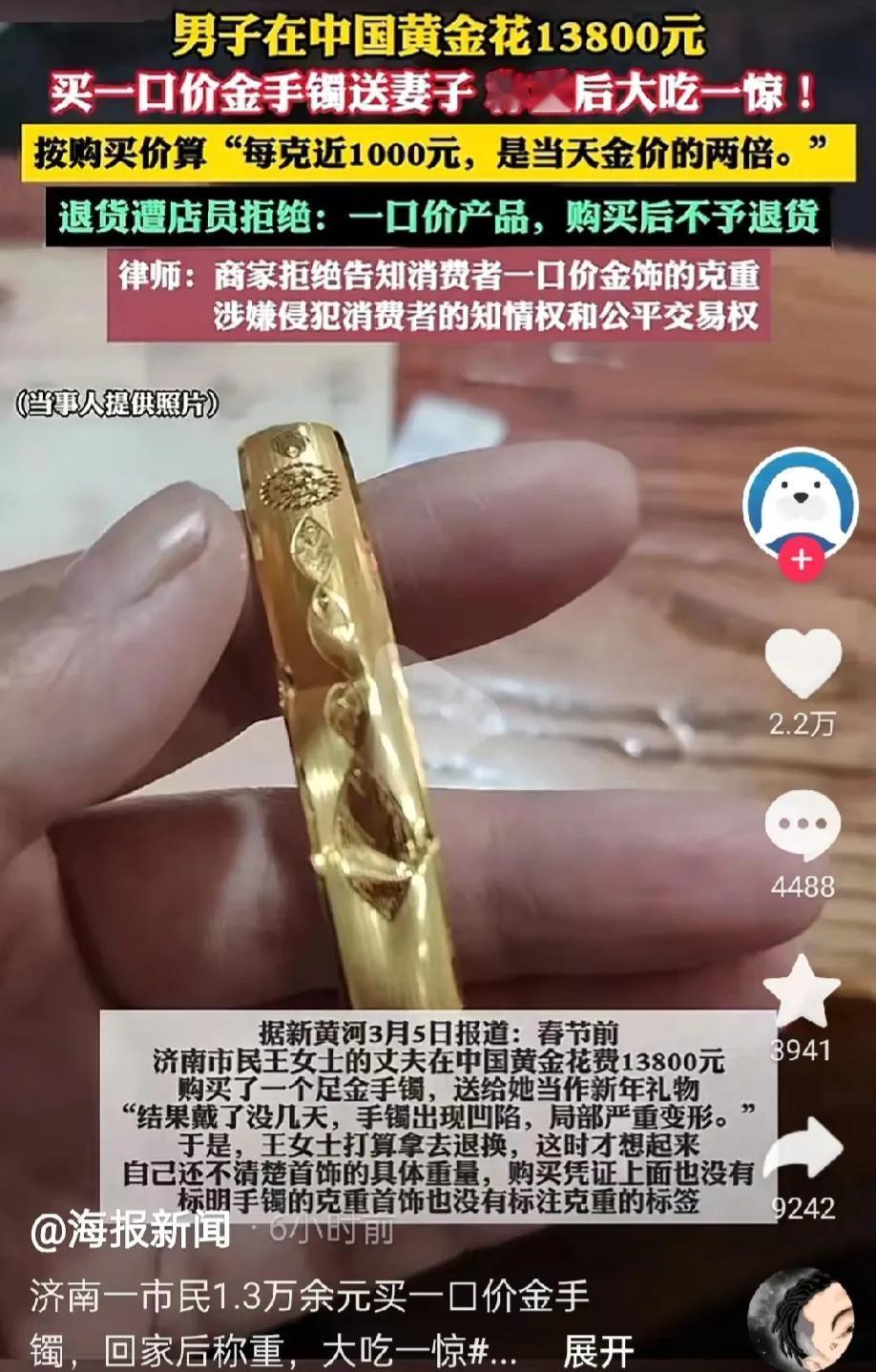 山东济南,一男子为了哄老婆金开心,花了1.38万元,在金店购买了足金手镯,当做新年礼物。不料,没戴多久,黄金手镯竟然有凹陷。女子一称重,黄金手镯竟然重量不到14克,折算下来,一克需要1000元,是当天黄金价格的两倍。女子拿去换,但是金店说不能换。