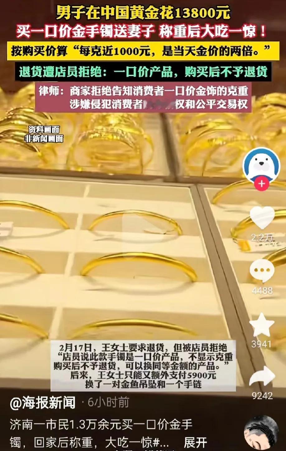 可是,这家金店的店员显然没有告诉王女士的丈夫这手镯是一口价,不是按照克重计算的。