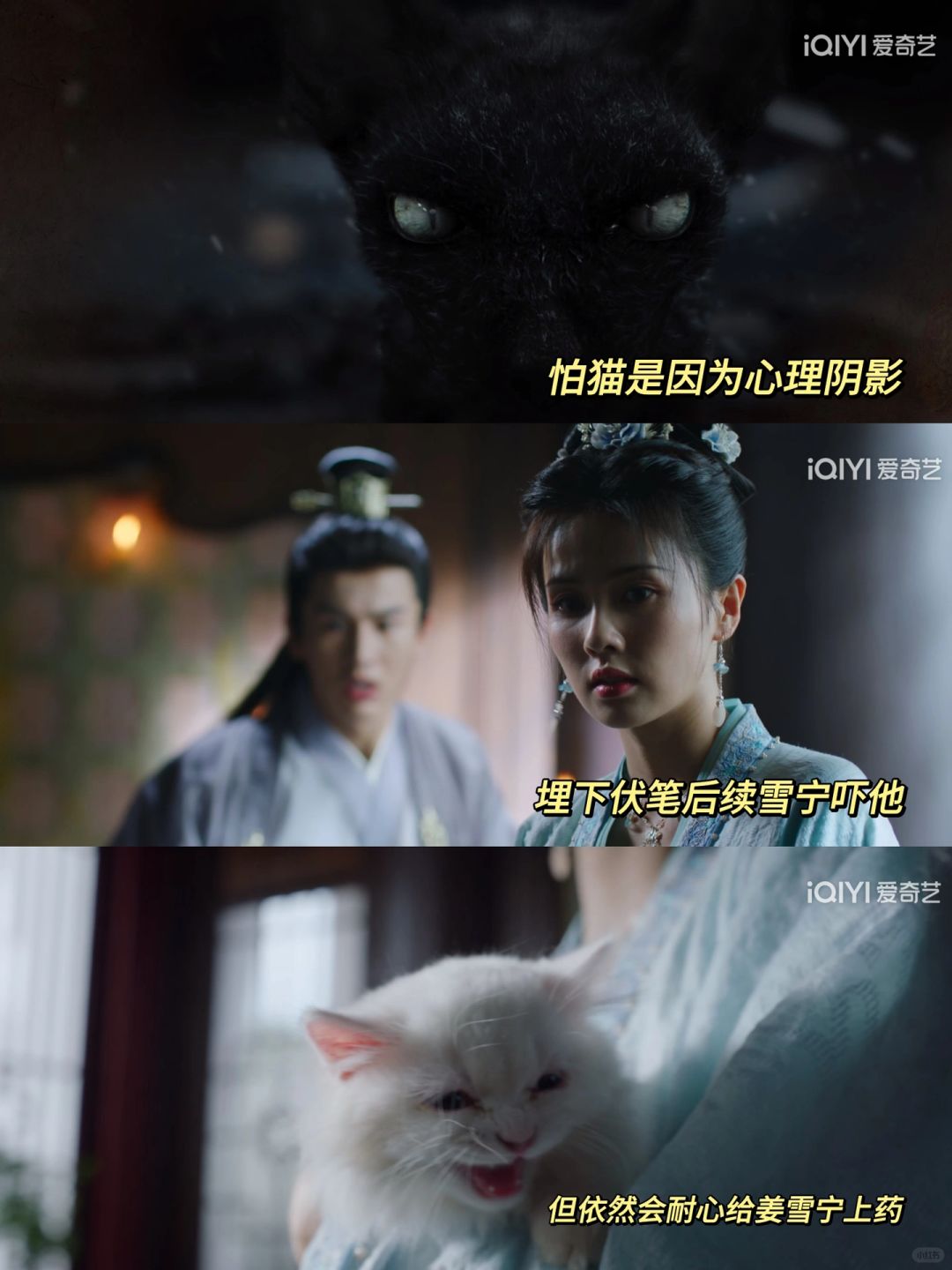 她偷听窥见到他的秘密,谢危发现姜雪宁,却也没有痛下杀手。按照谢危心狠手辣的个性,本是不可能放过的,但他却从未想杀她,甚至以此为由将她留在可及之处守护着。他年少时曾在尸山血海中见过黑猫啃食幼童尸体,特别怕猫,前面猫出现时慌张呵斥姜雪宁埋下伏笔,也让姜雪宁发现他的弱点,后来在姜雪宁用猫吓他后,还是会细心给她上药。