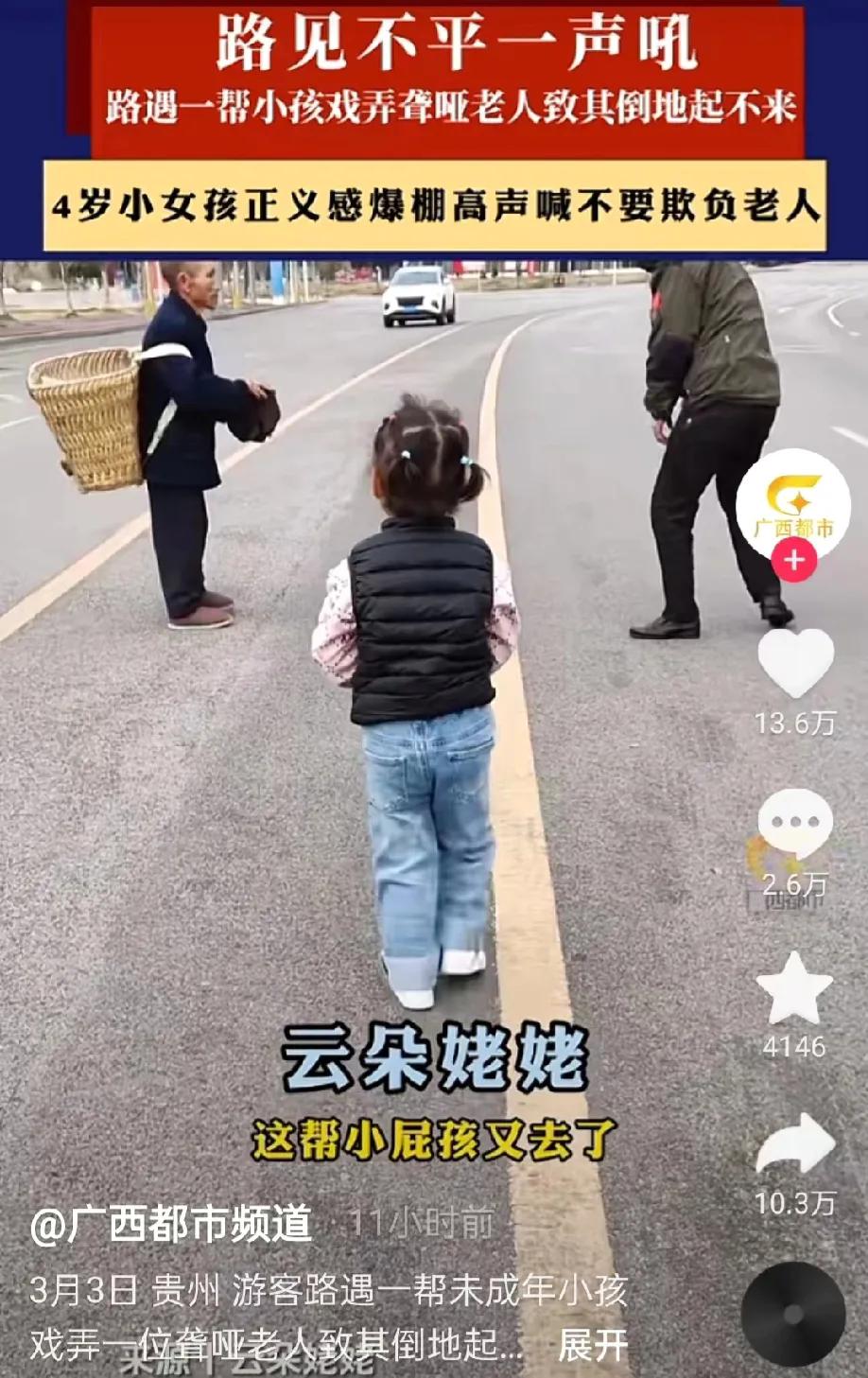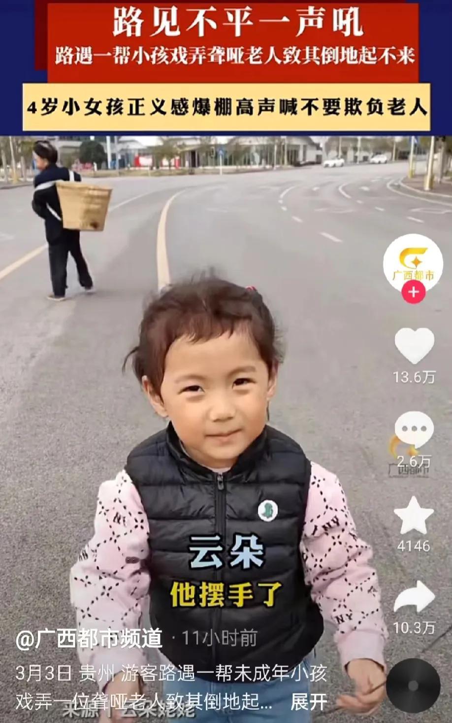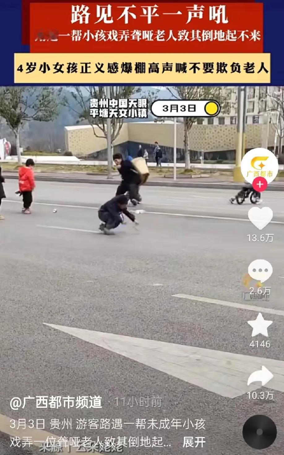 贵州,游客发现,在路上,有一群小孩追着一名老人,他们试图抢夺老人的东西。游客问原因,一群小孩说这名老人是聋哑人,游客说他是聋哑人,你们不能欺负他。游客的外孙女,一名4岁的小女孩,连忙摆手说不能欺负老人家。