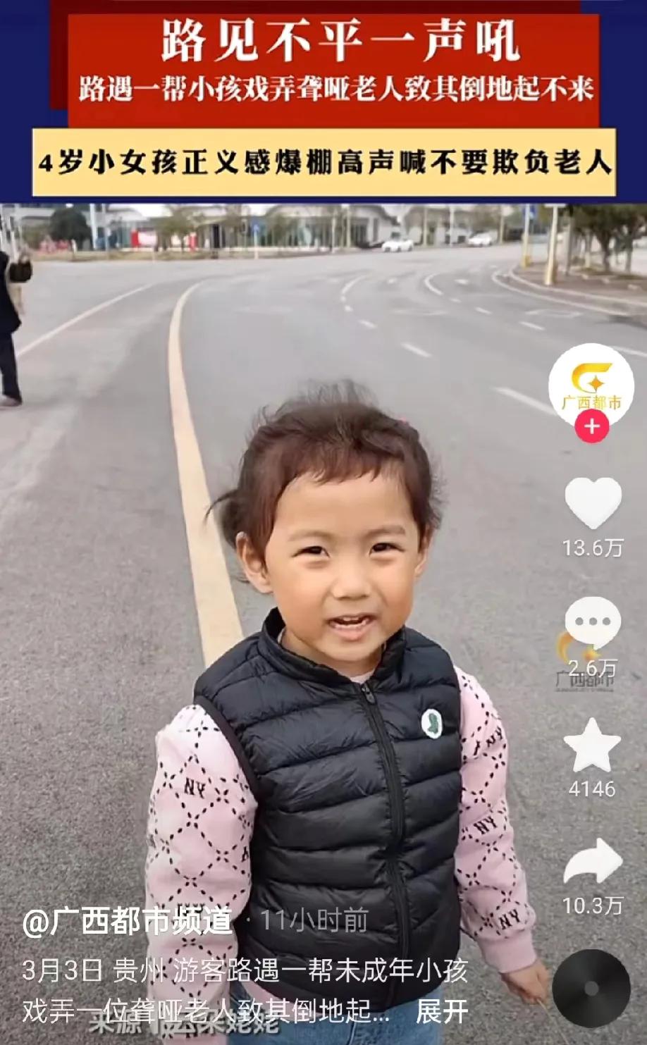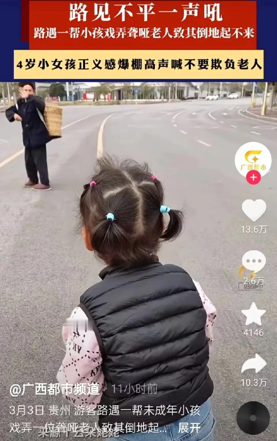 同样是孩子,贵州这群孩子追打一名聋哑老人,显得非常没有家教,而4岁的小女孩却非常有同情心,这不得不说是他们各自的父母的人品和教养的反射。