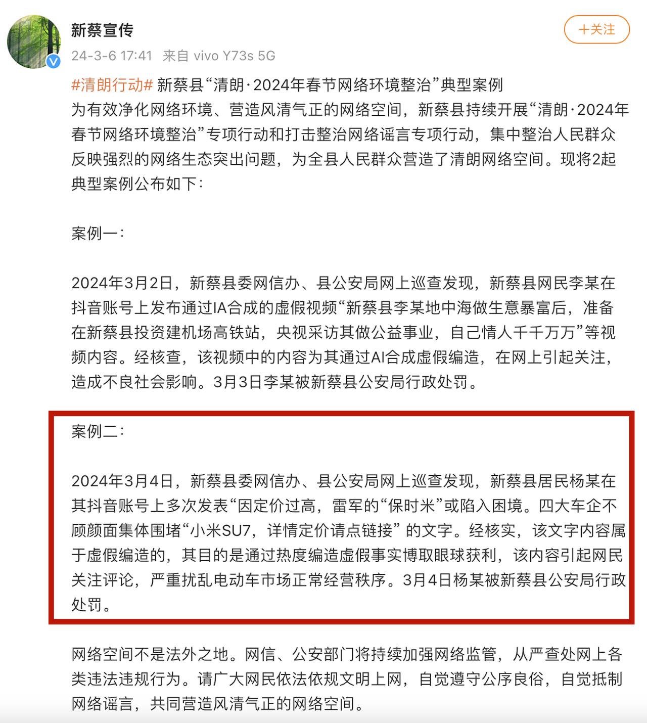 对于小米汽车能否成功,感觉没有讨论的必要,有黑子严选在那边监督,小米汽车的质量和体验绝对可以让人放心,当然小米这次对黑子也没有放纵,而是该出手时就出手,前不久董某某就因为长期发布嘲讽诋毁小米汽车的内容而被小米投诉。 不过有些人依旧顶风作案,近期河南省新蔡县网信办巡查发现,当地居民杨某在抖音上面多次发布关于小米汽车的虚假内容,从而获取流量来谋利,其行为无疑抹黑了小米的品牌形象,带偏了舆论导向,严重扰乱了新能源汽车市场的正常经营秩序,结果这人被当地公安局行政处罚了,不得不说这真的大快人心。 其实说起来也奇怪,小米作为汽车界的新人,按道理来说没有必要去黑,结果小米汽车技术发布会之后,网上抹黑小米汽车的内容就层出不断,也不知道这些人为什么那么害怕小米汽车成功,难道中国就不配多出现几个成功的汽车品牌吗?这些人干的那些事情怎么看都是在打压国产崛起,其心可诛啊!