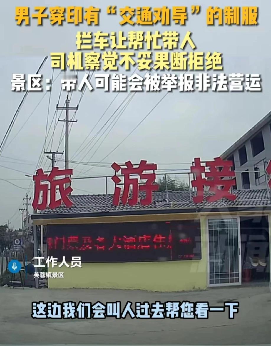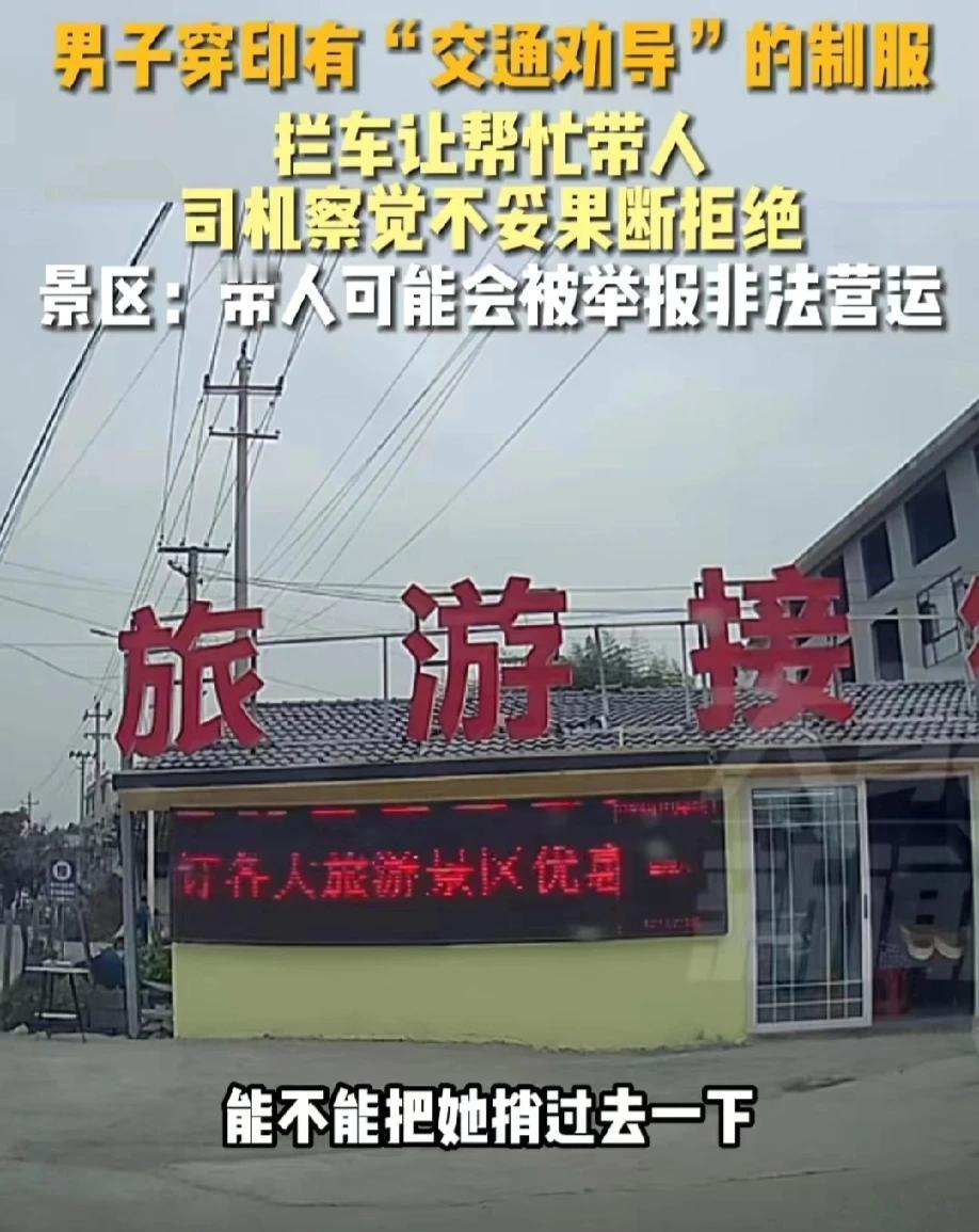 “钓鱼执法?”湖南湘西,一男子开车被身穿制服的男子拦下,询问男子的目的地。男子说去张家界。制服男请求男司机帮忙带一个同事的妹妹去张家界。可男子以东西太多拒绝了。制服男还不死心,说这个妹妹是在张家界开酒店的,男司机有什么事可以相互帮助。但男子还是拒绝了。当地景区工作人员回应道,不要信,很有可能会被举报非法营运。
