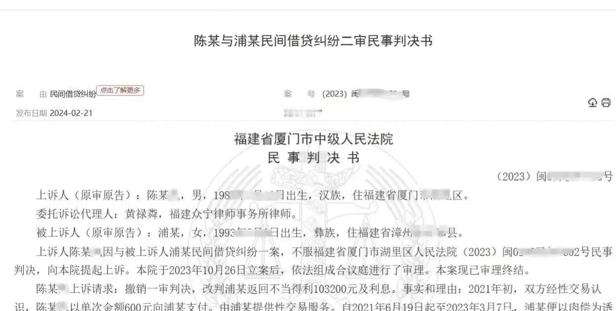 福建厦门,一男子认识了一女子,女子每次收男子600元,然后双方发生关系。女子向男子借款103200元,而后女子提议,每次发生关系就扣除600元。可是女子却言而无信,双方很少见面。男子大怒,一纸诉状将女子起诉,要求女子归还103200元的本金和利息。最后,法院是这样判的。