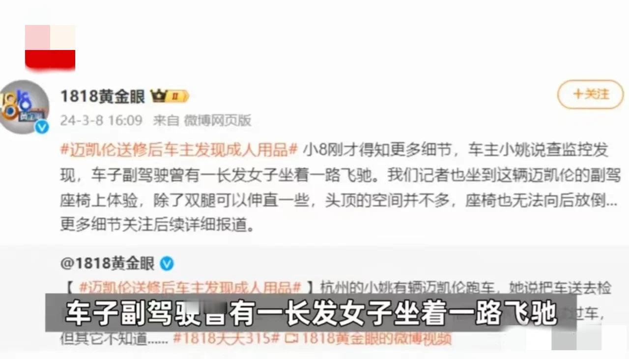 浙江杭州,女子花了210万购买了一辆迈凯伦跑车,可是送去汽修店维修贴膜时,发生了意外。在跑车上发现了避孕套和被药水污染了的污渍,更可恶的是里程增加了180公里。女子质问汽修店老板,老板承认将车开上了高速路,说那是必须的,是为了做四轮驱动测试。对于车上发现的避孕套和污渍,老板却矢口否认。