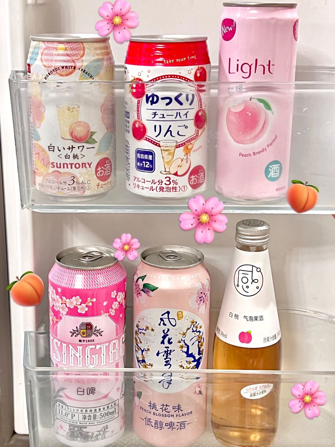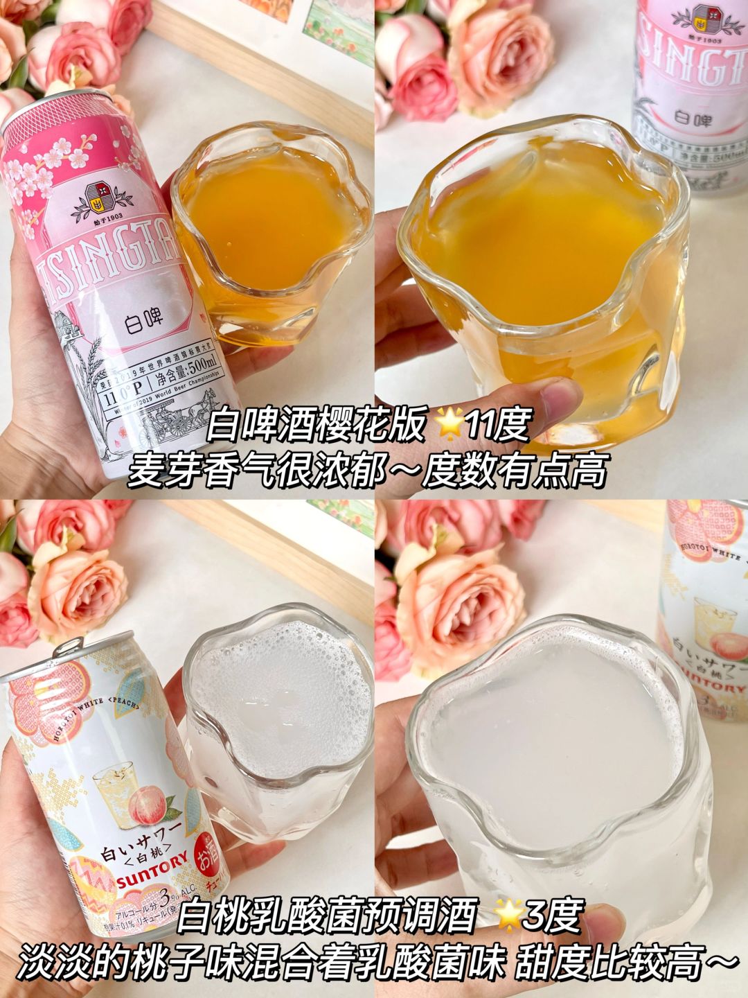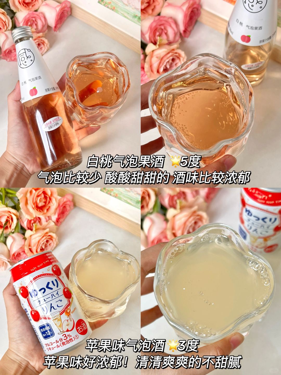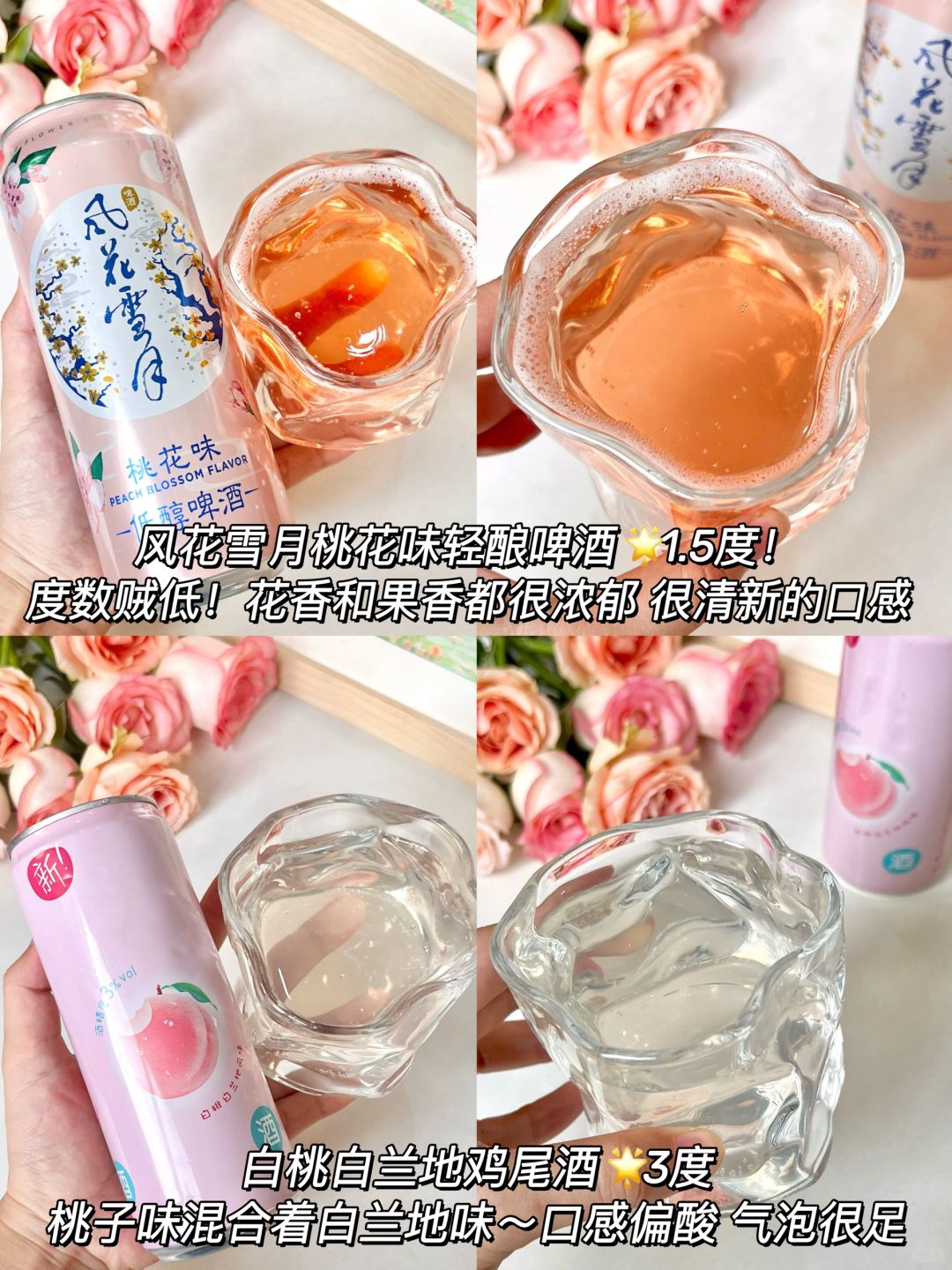 作为一个爱微醺的小酒鬼 🥂看到小甜酒就走不动路了啊啊! 真的又菜又爱喝hhhh🤣 买了几款高颜值的回来给大家测评! 1⃣️风花雪月桃花味轻酿啤酒:1.5度!度数好低 对女孩太友好了!! 开盖就能闻到好清新的桃花香🌸入口果味好浓郁! 气泡很柔好绵密~清清爽爽的 贼好喝!一瓶喝完微微醺的感觉太舒服啦 不上头没负担! 包装好好看好浪漫啊~酒液是粉色的 少女心拉满! 2⃣️微醺白桃味鸡尾酒:3度!桃子味混合着白兰地味 气泡很足口感偏酸~ 3⃣️白啤酒樱花版:11度!麦芽香气很浓郁 包装好看但口味和普通啤酒很相近~度数有点高容易上头 4⃣️白桃乳酸菌预调酒:3度!淡淡的桃子味混合着乳酸菌味 甜度比较高~ 5⃣️白桃气泡果酒:5度!气泡比较少 酸酸甜甜的 酒味比较浓郁~ 6⃣️苹果味气泡酒:3度!苹果味好浓郁!清清爽爽的 不甜腻 我坠爱的还是风花雪月桃花味轻酿啤酒,姐妹聚会的时候都喝它hhh 好喝又好看!已经囤了一冰箱了! 小酒鬼们都去试试后在评论区留下你们心目中坠喜欢的酒!