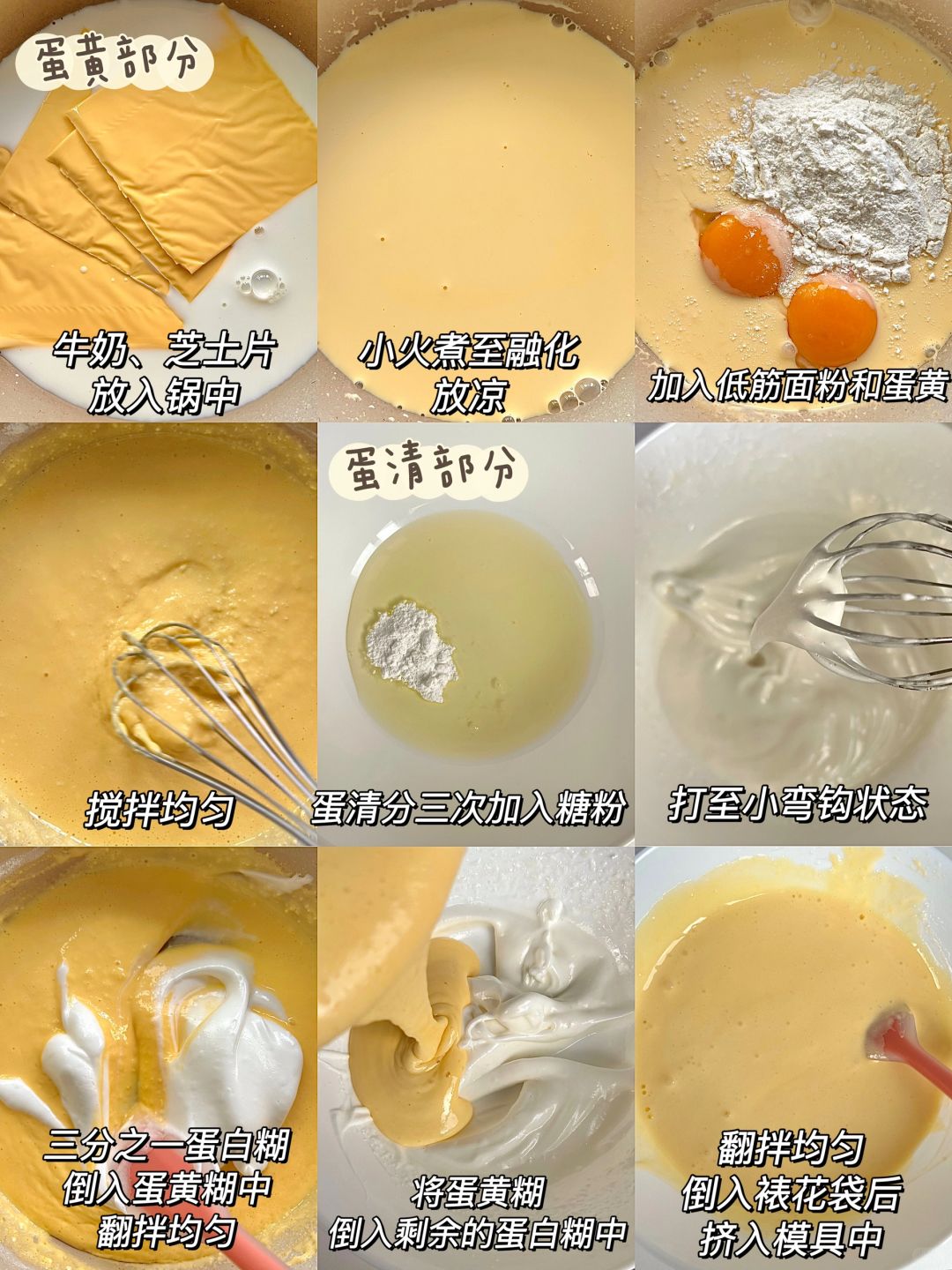 材料:鸡蛋两个 芝士片四片 低筋面粉35g 白糖25g 牛奶100ml