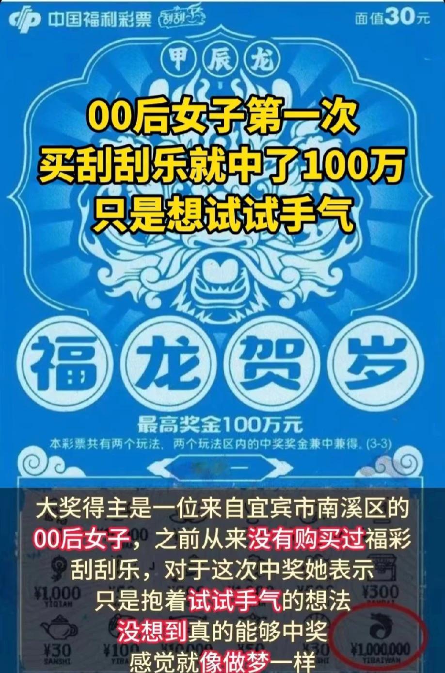 四川宜宾,一00后女子,花了30元,购买了一张刮刮乐彩票。不料,这张彩票给她带来了100万元的巨奖。起初,因为女子是第一次购买,不懂中奖规则,以为没有中奖,想要将彩票丢掉。幸好女子的朋友多看了一眼,才发现中大奖了。女子和朋友开心的大喊大叫。女子说,这笔钱将用来改善家庭生活和实现自己的梦想。网友说:这该死的新手保护期!
