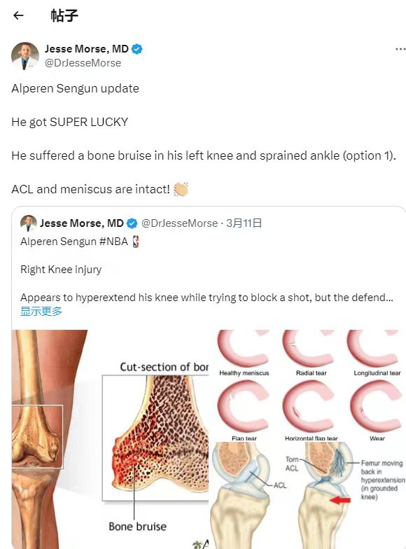 火箭申京受伤之后一直让人十分担心,而最近记者Woj已经发布消息,称申京仅仅只是遭受了脚踝3级扭伤,需要3-4周就能恢复,大概率赛季就此报销。 随后医疗专家发布了一片报道,表示申京ACL和半月板都能完好无损,简直非常幸运,他是一个Luck Boy,或许是因为申京练瑜伽的缘故,才让他免受这次大伤侵袭!
