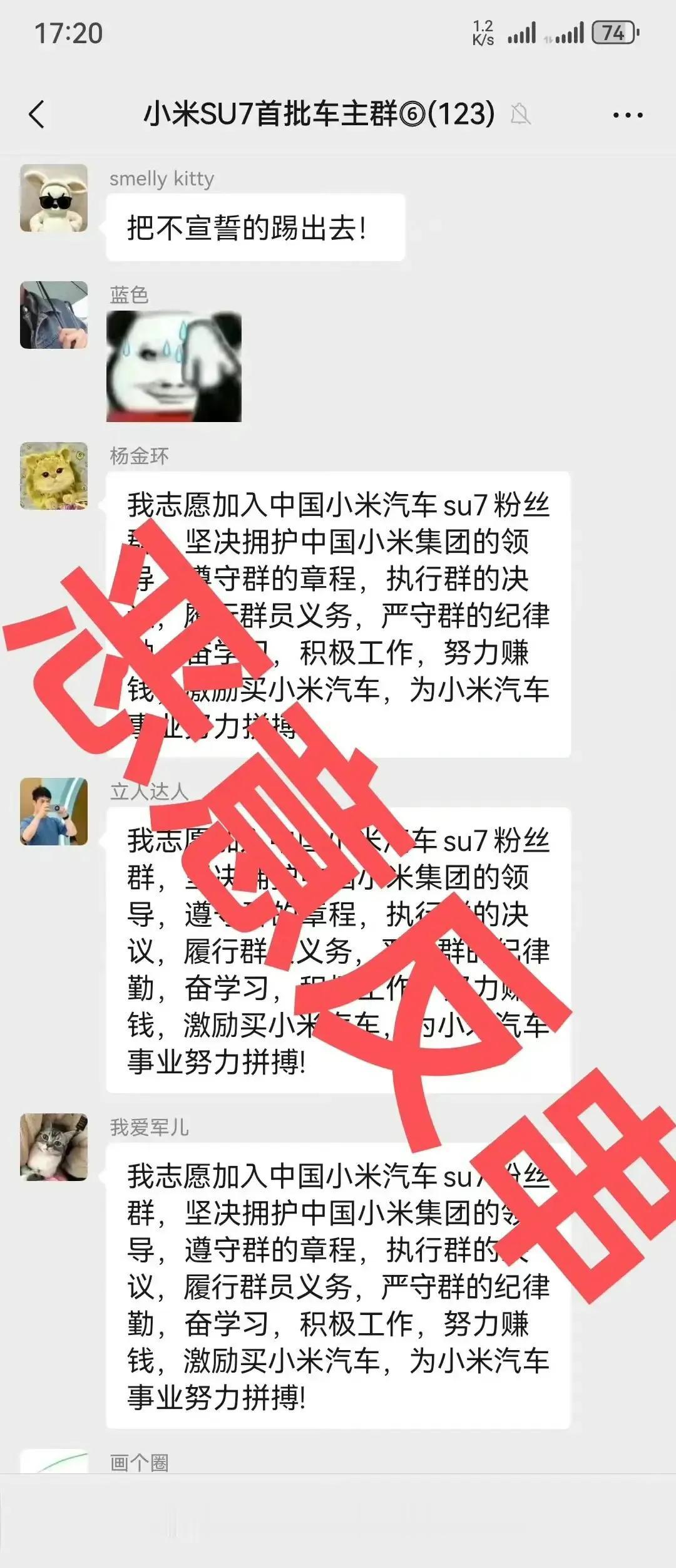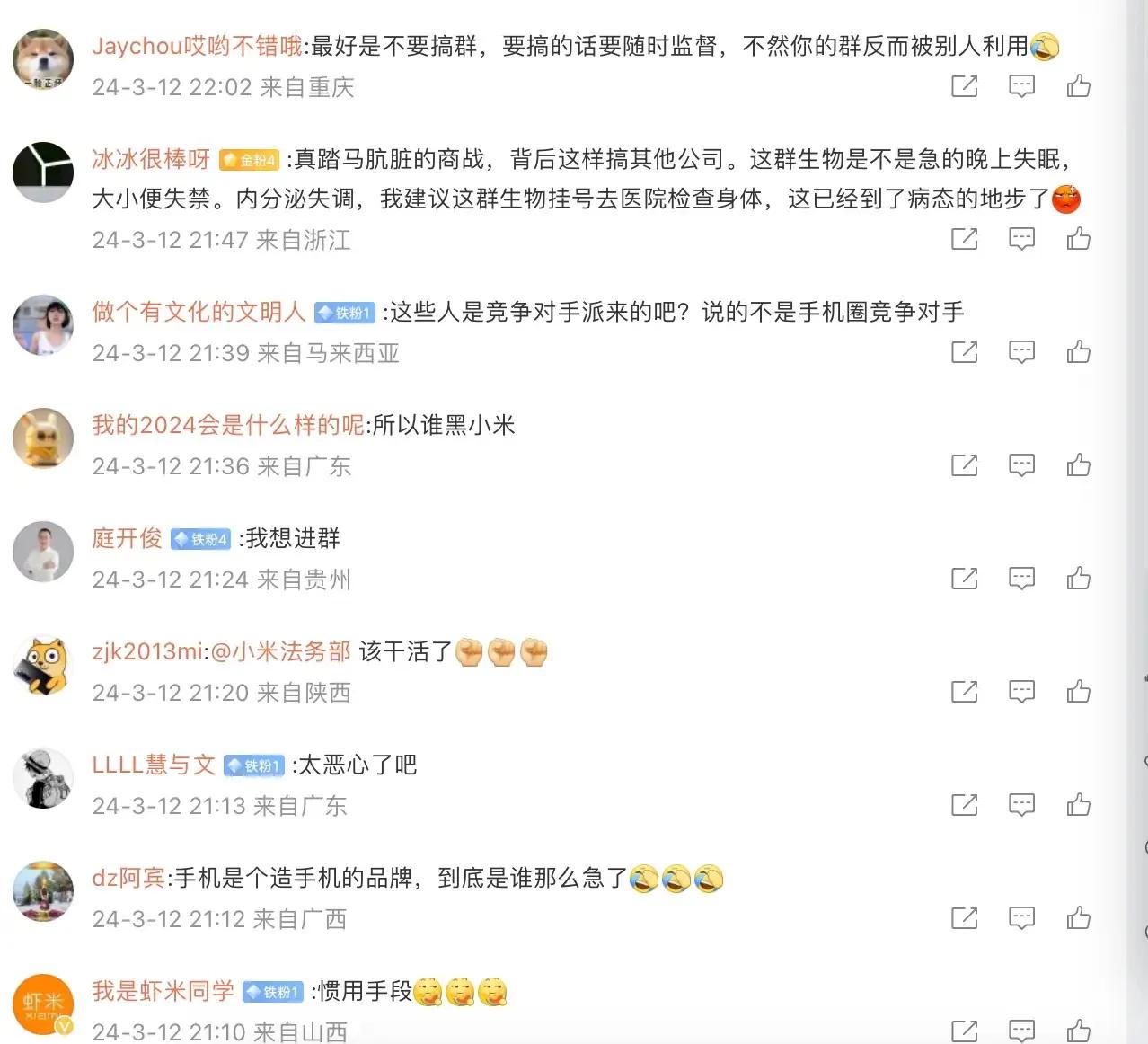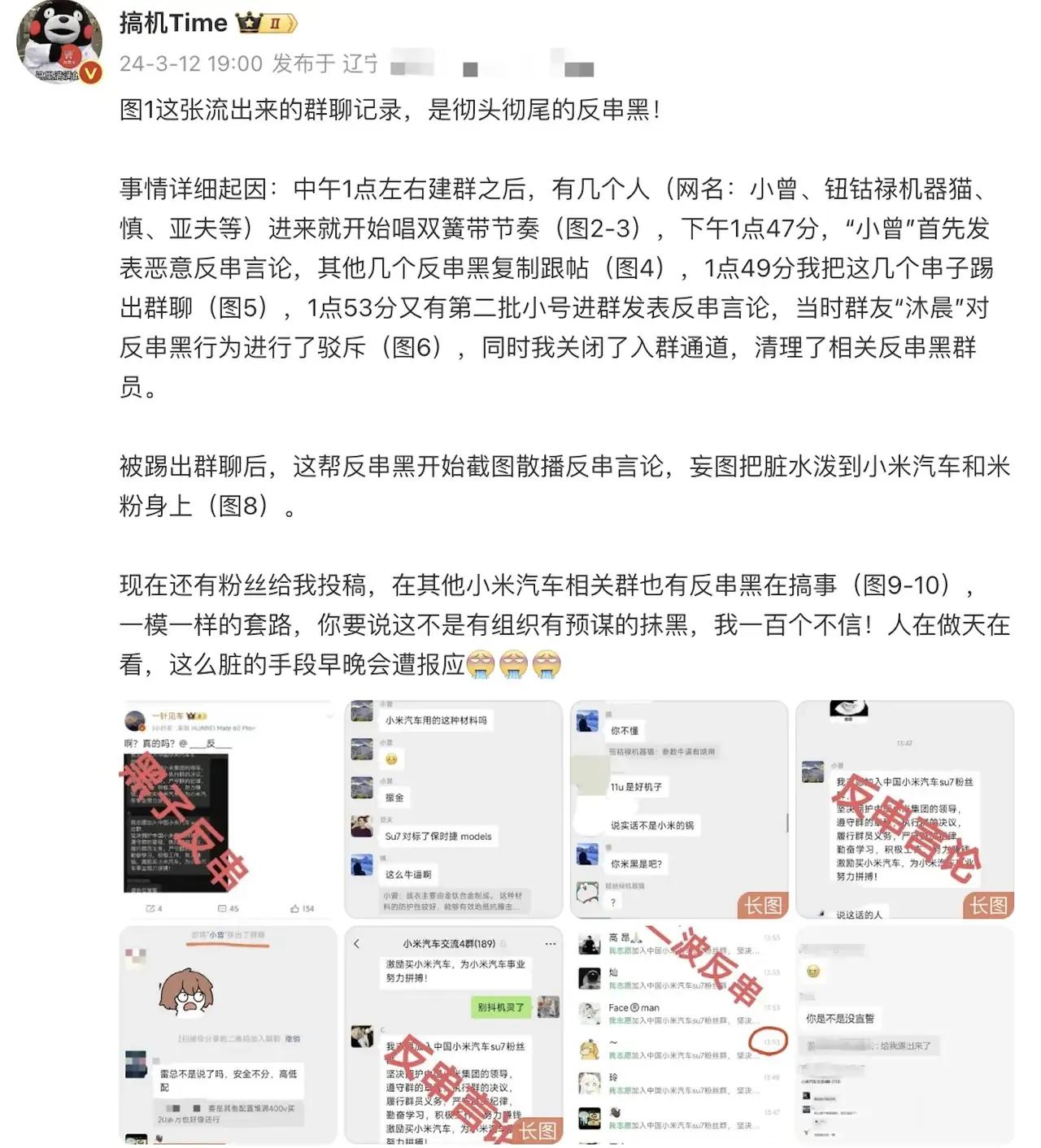 小米这次是粘上狗皮膏药了,虽说对于小米汽车不会有很大的影响,但的确挺恶心人的。 小米SU7刚刚公布发布日期,那群人又开始上蹿下跳了,这次换了个玩法,开始搞起了反串,看了下具体情况,就是在小米SU7的汽车交流群里面,突然出现了一大批反串黑在那边带节奏,他们的目的其实不难推测,先是通过反串把小米SU7交流群的群友抹黑成为小米汽车的信徒,然后再将这些反串内容给传播出去,从而让不明真相的吃瓜群众对小米汽车形成不好的印象。 实话实说这套路并不高级,稍微有点脑子的人都不会上当,毕竟这意图太明显了,很多网友对于这种做法也表示了不满,认为市场竞争更多的还是要靠产品说法,如果使用这种下三滥的手段赢得了市场,那就是典型的劣币驱逐良币,对于中国汽车产业的发展不会有正面作用。 对于网友的相关看法只能说举双手赞成,如果这个市场真的这么玩下去,最终剩下来的都是那些只会操弄舆论的,那特斯拉估计要笑醒。