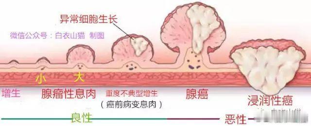 结肠癌的发生发展过程,依次为肠黏膜增生、腺瘤性小息肉、腺瘤性大息肉、重度不典型增生、腺癌,再到侵润癌!见图2