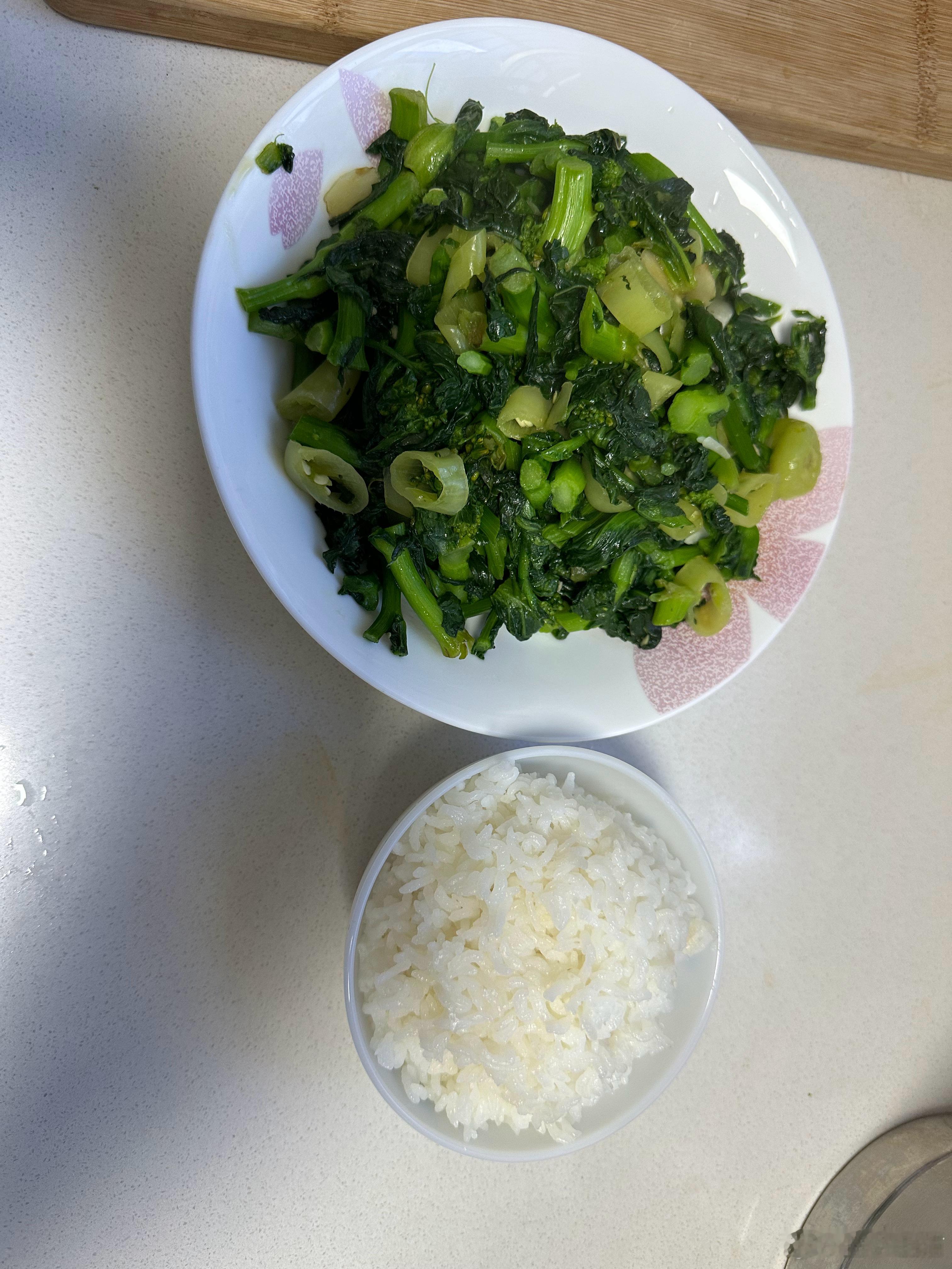 下班后,谢绝了一位朋友饭局的邀约,回家,炒了个青菜,合着一碗米饭,吃个晚饭。