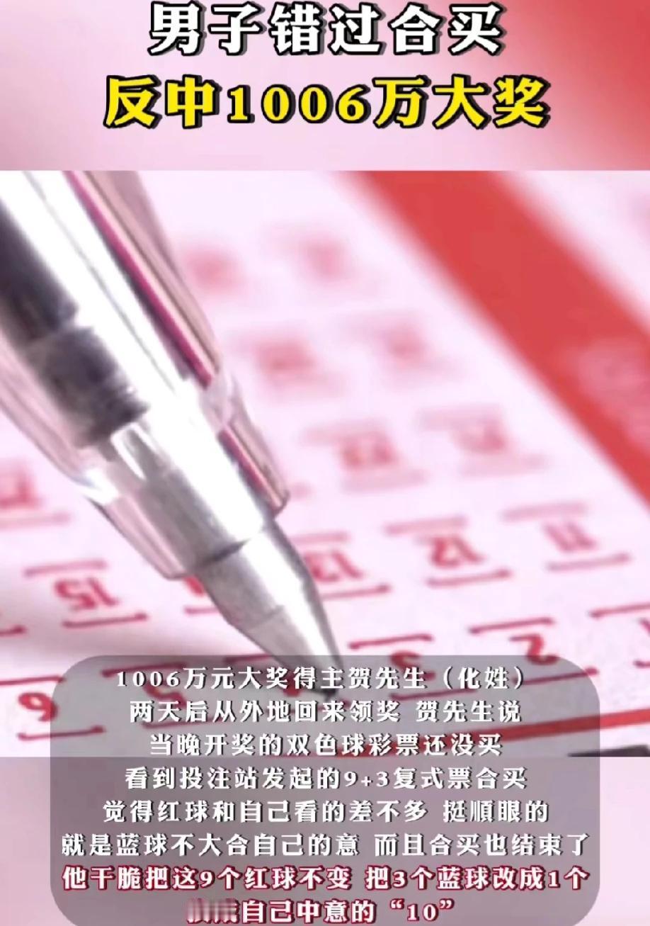 想不到就这么轻轻的一改,贺先生就中了一注一等奖和众多的固定奖,合计中奖金额高达1006万元。