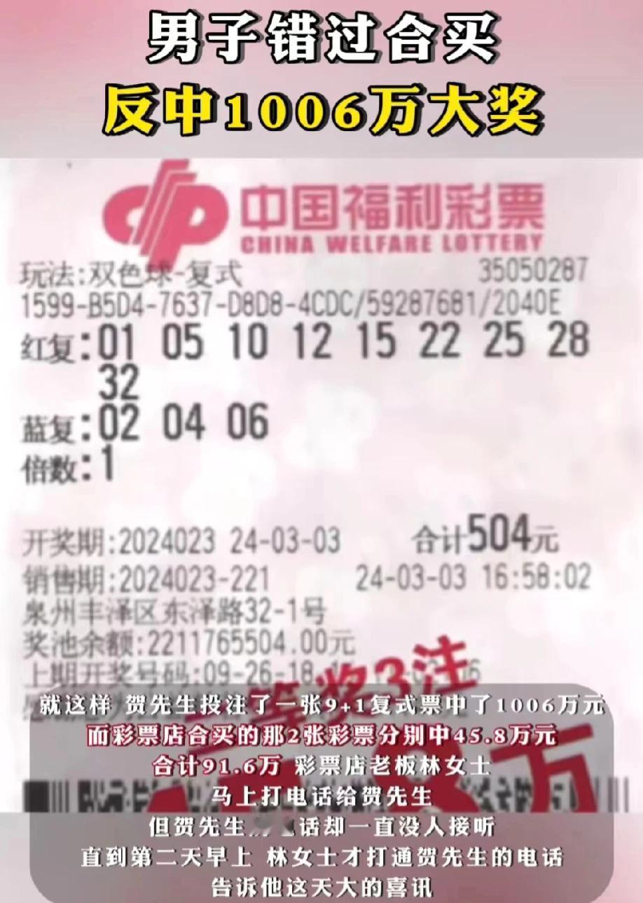 这中间还发生了一个小插曲。彩票投注站老板林女士第一时间知道贺先生中了1006万元的巨额大奖,想要第一时间通知贺先生,奈何拨打贺先生的电话打不通。