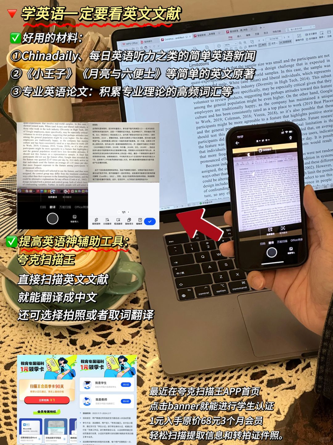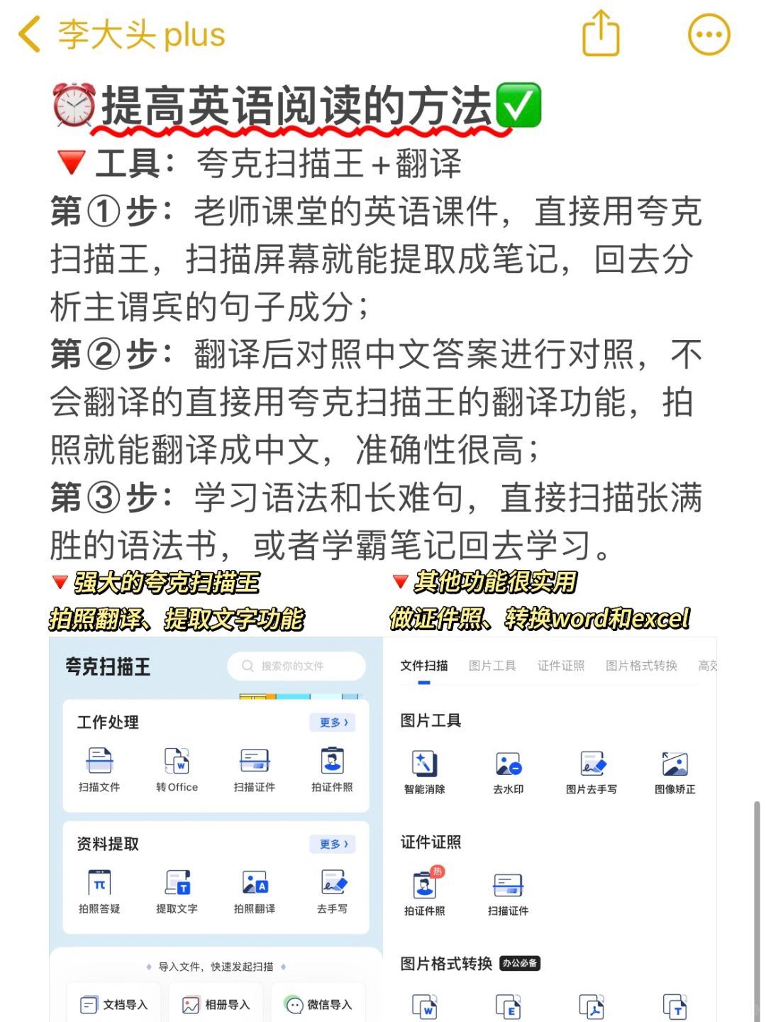 练语法要配合阅读,方法①看语法书,②搜集身边英语学霸笔记和经验贴。但别人笔记杂乱不好系统整理,用夸克扫描王一键提取文字功能,智能优化纸质资料排版,高清扫描。斜着拍也能自动校正生成高清扫描件,再将资料导成pdf整合,不用等就形成自己资料。夸克扫描王app对提高学习效率很有用,最近端内有教育福利,大学生或教师在首页点击banner认证,1元入手原价68元3个月季卡会员立省67