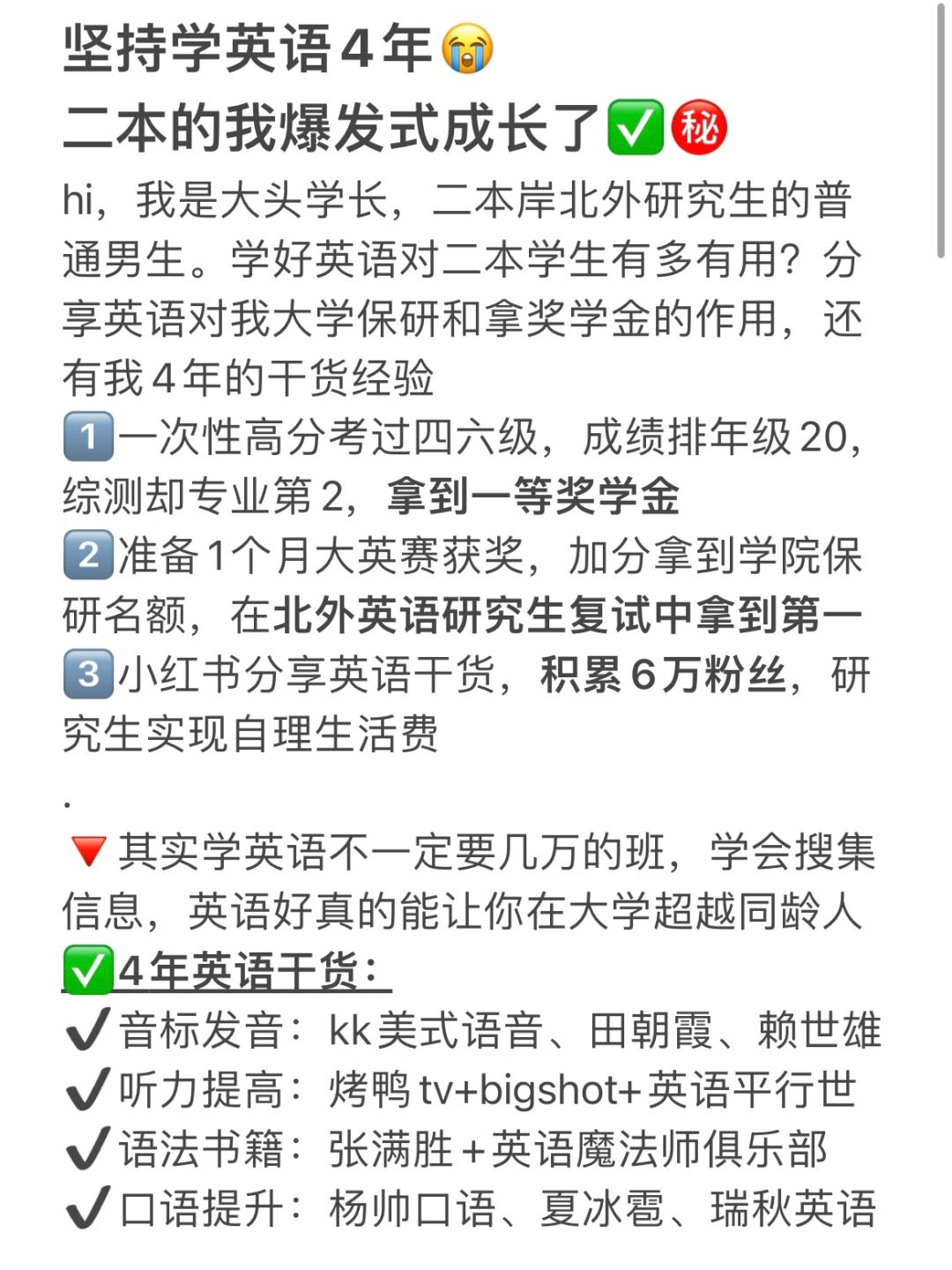 ①高分过四六级,我加分拿到一等奖学金:②备考大英赛拿奖,在北外英语复试第1;③自媒体分享英语经验,涨粉6万,大学经济独立。分享我的6年经验干货✅