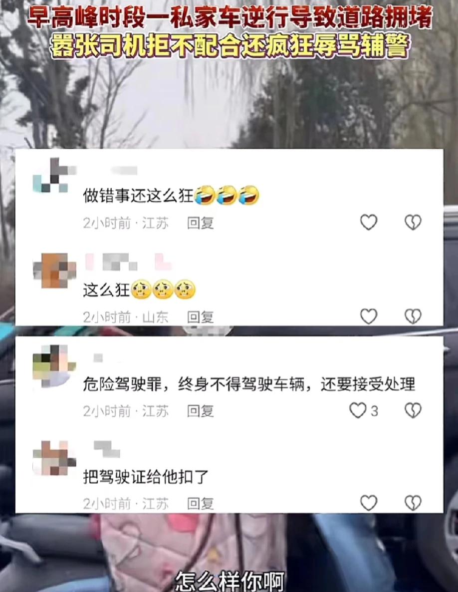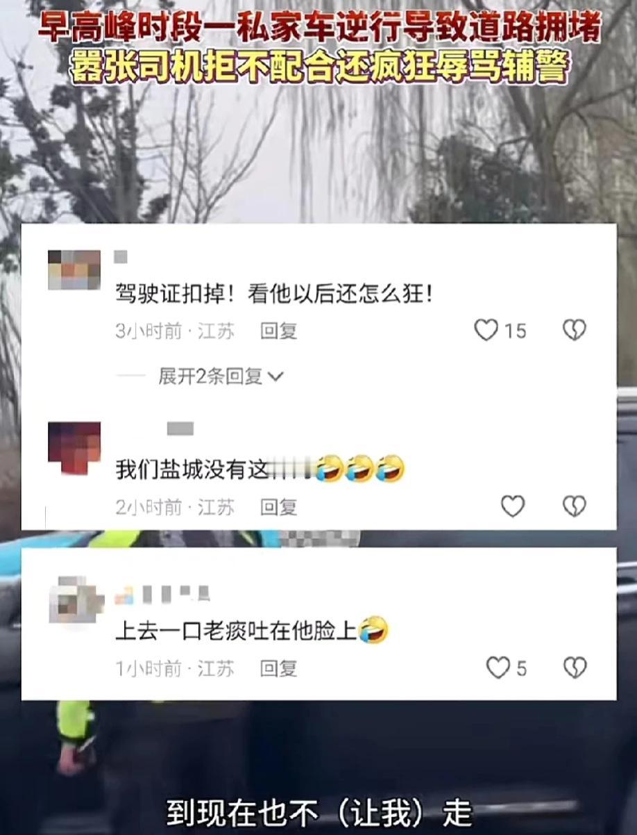 江苏盐城,在早高峰的时段,一名男司机逆行,导致道路交通拥堵,辅警看见后,过来催促男司机赶紧调头离开。不料,男司机恼羞成怒,肆意辱骂辅警,骂的很难听。就连围观群众也看不下去了,将男司机的丑行拍下,发布到网络上去。网友说:罚死他,看他还嚣张不。