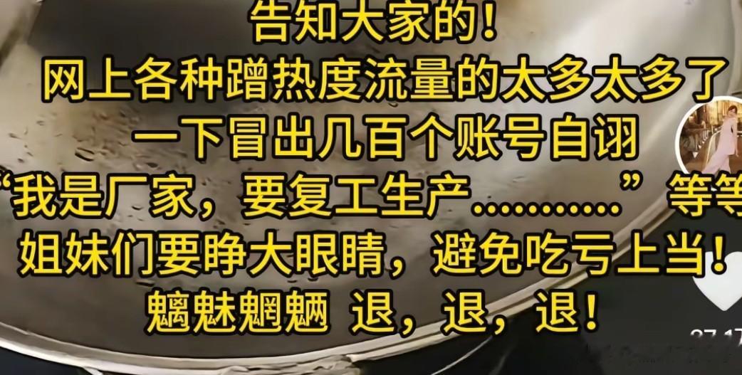 为了避免网友们上当,女博主发视频澄清目前还没有找到厂家,希望网友们要睁大眼睛,避免吃亏上当 , 还非常愤怒的 斥责这些厂家是魑魅魍魉 ,退,退,退!