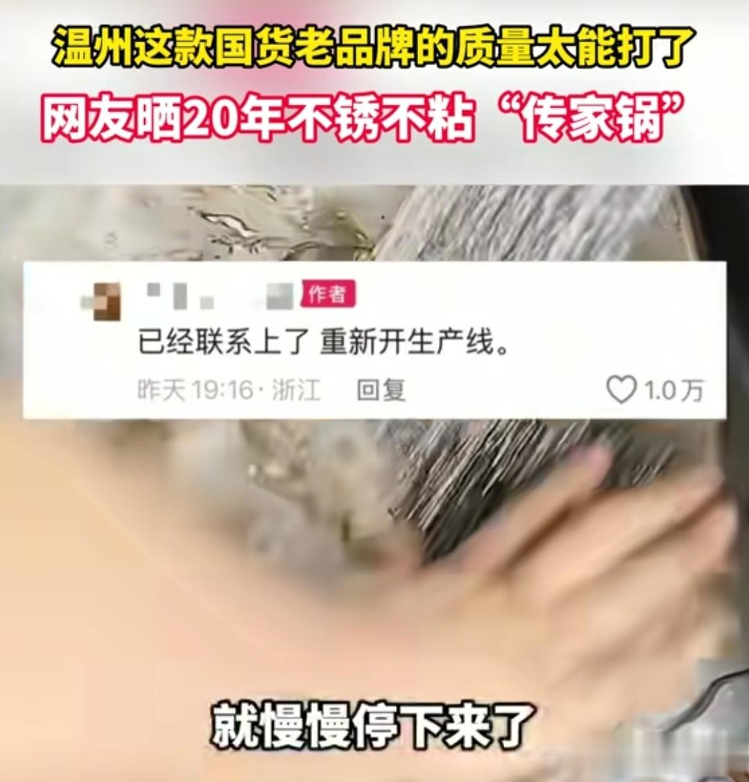 她说这口锅婆婆用了10多年 , 她拿来用了20来年还没坏, 不生锈也不粘锅,只是因为由于用的时间太长,锅底有些薄, 她就想再买一口锅,不知道这个厂家还有没有再生产。 毕竟已经30多年了 , 希望厂家能够联系她一下,她好去买锅。